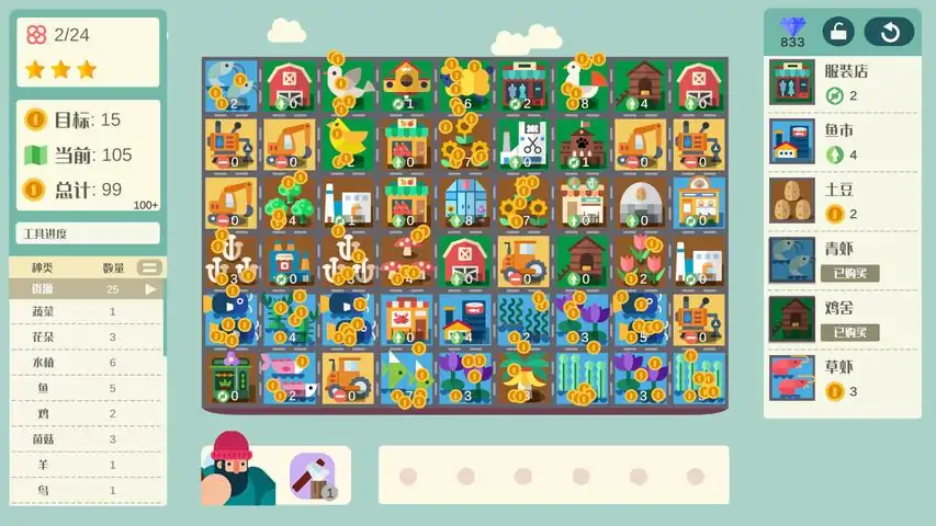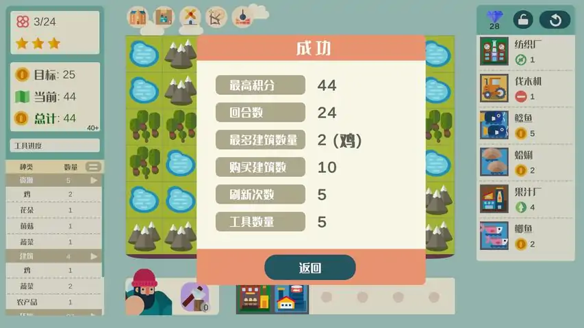 绿叶小镇是一款农场管理类游戏,含有肉鸽玩法元素。你可以在这里经营自己的牧场小镇。通过购买农场建筑、摆放搭配效果、探索扩建地图、使用肉鸽道具等方式,获得更高的收益。在单局游戏中,每回合都有目标金币的收益要求。你需要通过在商店中选择购买相应的建筑,并通过合理的摆放获得加成,从而满足收益要求。你还可以不断累积获取强力道具的效果,进一步加强建筑的收益。每局游戏的地图都将完全随机,包括能获得的建筑和道具。游戏本身拥有上百种建筑和道具,确保你在每局游戏中都能获得不一样的体验!当前游戏还在开发中,如果喜欢,请先将游戏加入愿望单。如果想要第一时间了解游戏相关开发进度,可以加入QQ交流群:936761159