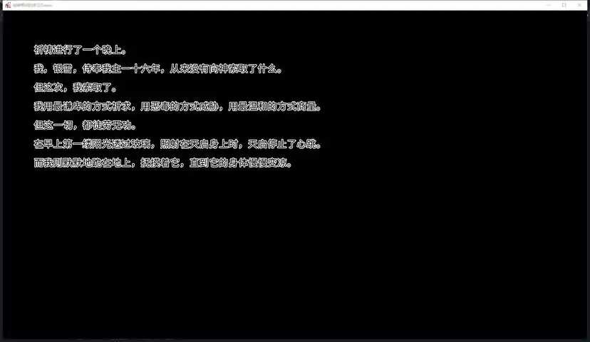 About自新迦南成立以来,神明已经庇佑了新迦南四百年,而所有人——包括修女银雪——都觉得这样的日子会一直持续下去,直到那天,银雪遇到新迦南的神明。自此,自称为神的少女,与将成为神的少女之间的故事开始了。Story在新迦南,神是真实存在的。从每天的天气,到今年的收成,再到人的生死,她几乎掌握着新迦南的一切。她也庇佑着新迦南无灾无害,风调雨顺将近四百年。可就是这样的神,有一天突然告诉你。“我既不全善,也不全能。”并邀请你踏入神的领域,这个时候,你会怎么做呢?但不论怎么做,在你见到她的那一刻,剧本便早已被她写好。而结局,便是旧世界的毁灭,和新神的诞生。“神永远庇护新迦南”透过修女银雪的眼睛,观察由神赐予的土地上人们的生活与风土人情,并从点滴的细节中了解前三次大崩塌带给这片土地的影响,并随着故事的进展,逐渐了解这片为什么变成这样,以及人类为了留存新迦南,做出过什么样的努力。神谕与第三次大崩塌神曾经许诺,神谕可以保证新迦南免受第三次大崩塌的影响,但若果真如此,那么之前的三次大崩塌神谕为何没起到作用?而又为什么,神在第三次大崩塌之后才降临的新迦南呢?神性与人性,终将难解难分当身为修女的银雪与神明玛利亚将在新迦南发生一场命中注定的邂逅,而在之后的相处的过程中,玛利亚将慢慢被剥去神性的光环,回归那个恋家的孩子,而银雪则将慢慢获得神性,成为剩下人类的神明。但实际上,人性与神性并非是那么泾渭分明的东西,就像星光溶于月光,就像亲情溶于爱情,神与人之间它们终将难解难分。“神明穿着水手服”这是自称为神的少女,与将成为神的少女之间的故事——在新迦南。Feature一个让人回味无穷的软科幻故事可爱的角色以及专业CV精心准备的CG和画风精美的BG还有十余首动听的BGM制作组官群:953202123最后由衷得感谢小天使——雨涵,提供的日语翻译。十分感谢!