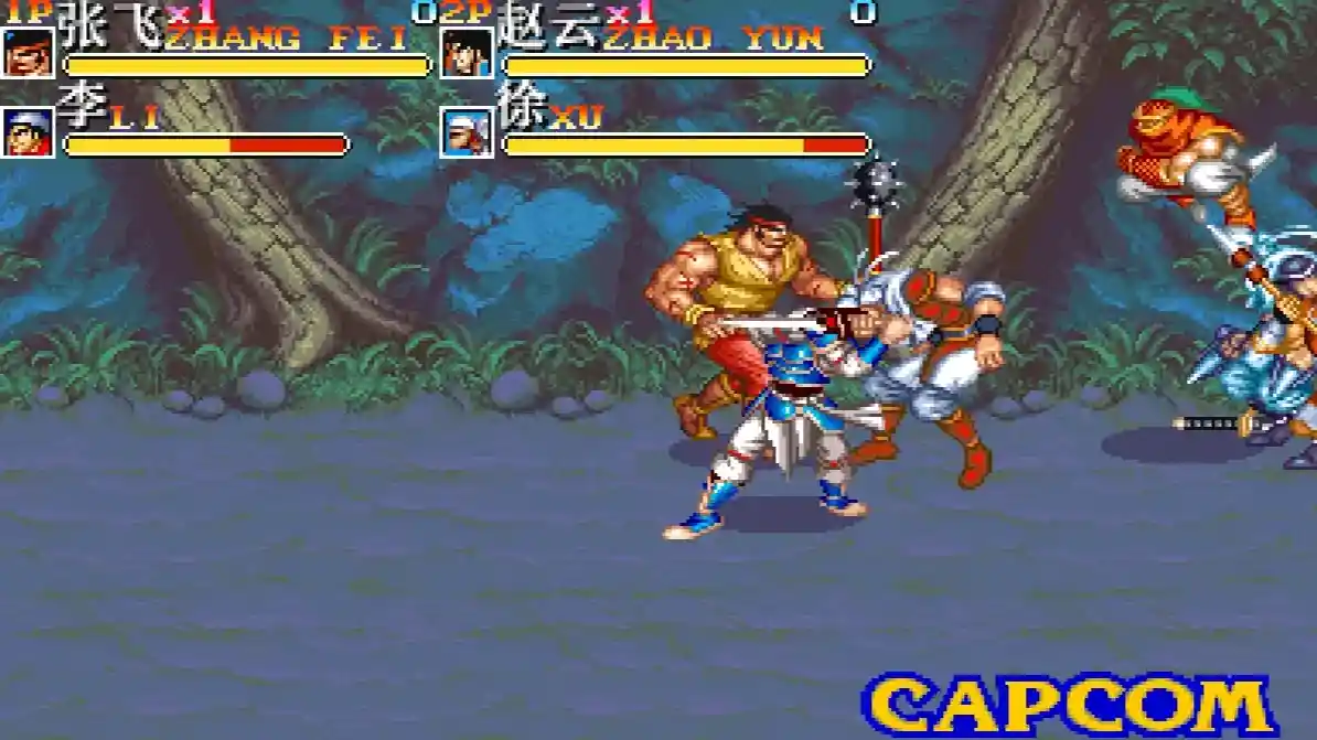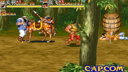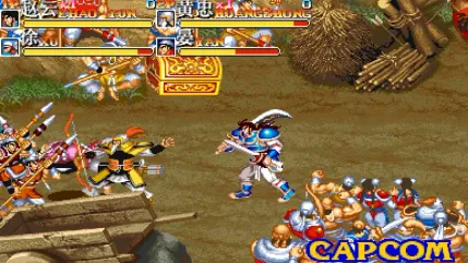 2.8 万 热度 1992 年 Capcom 推出的横版清版动作游戏,日版名《吞食天地 II 赤壁之戰》,美版《Warriors of Fate》。版本核心差异在角色名:日版保留关羽、张飞等三国原名,国际版因版权改名(如关羽改 Kuan Yu),玩法与关卡一致。 原版无中文,本游戏为民间汉化版。 版本特色:9 关剧情改编自《三国演义》,从博望坡到赤壁之战,对抗曹操势力;每关满布士兵、弓箭手等杂兵,关底迎战夏侯惇、吕布等魏将,终局对决曹操;支持 3 人同屏联机,击败敌人掉落道具回血、加分。