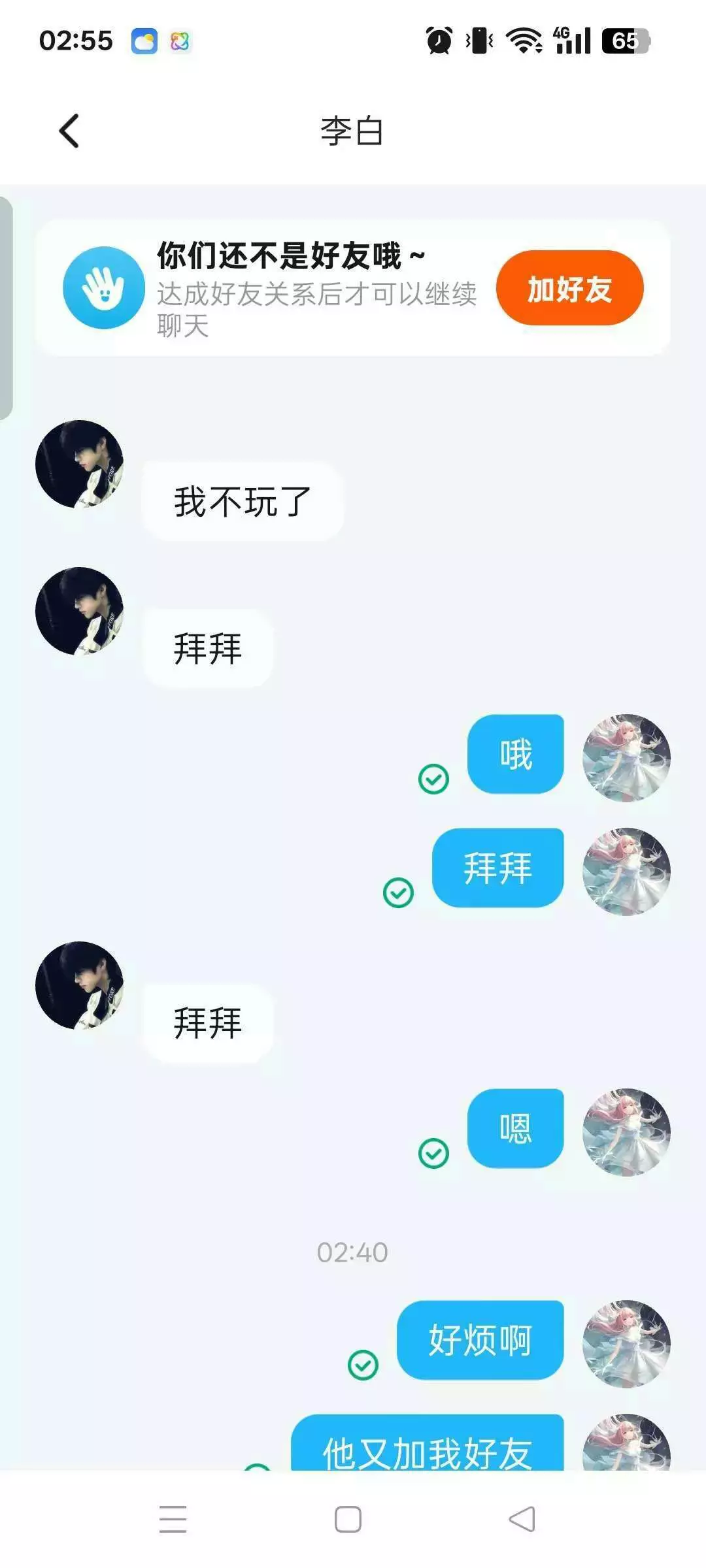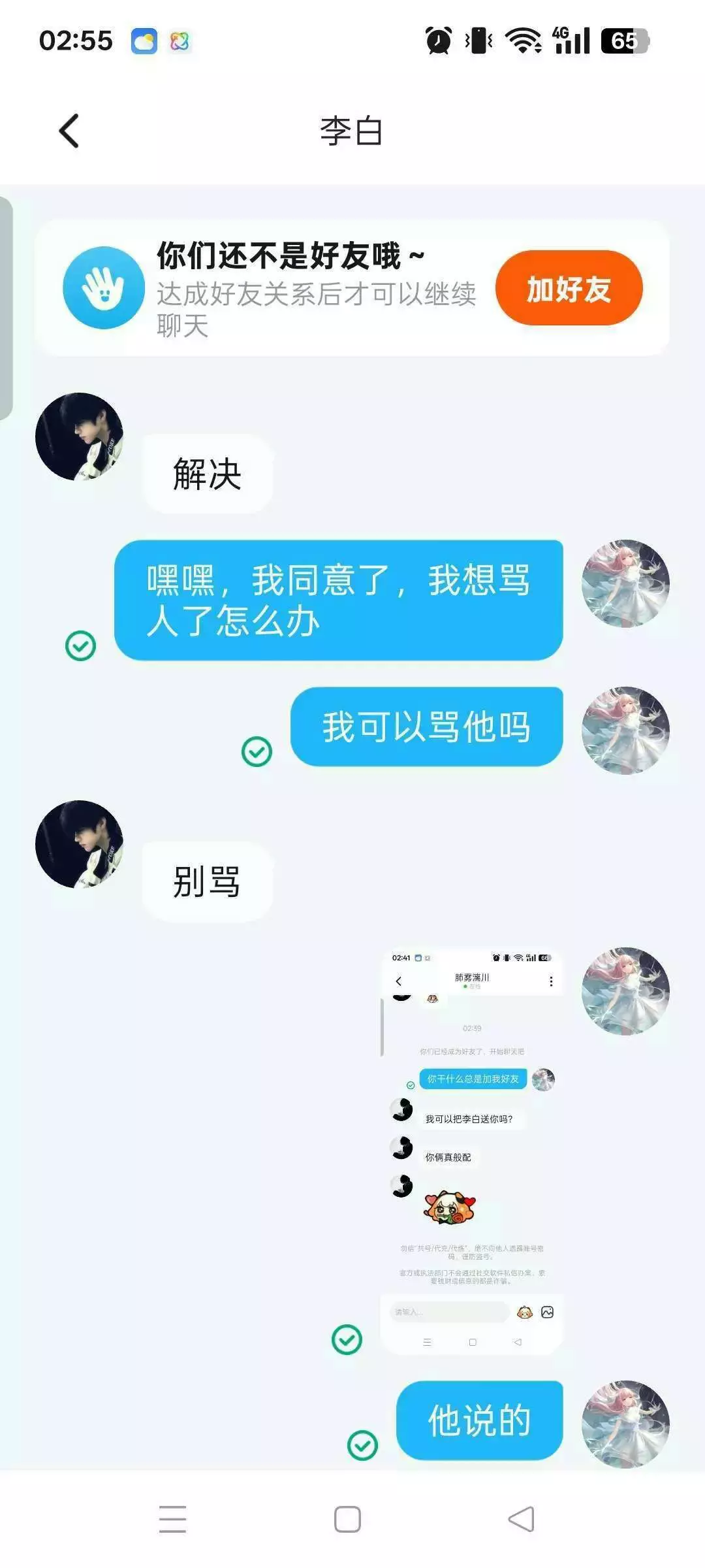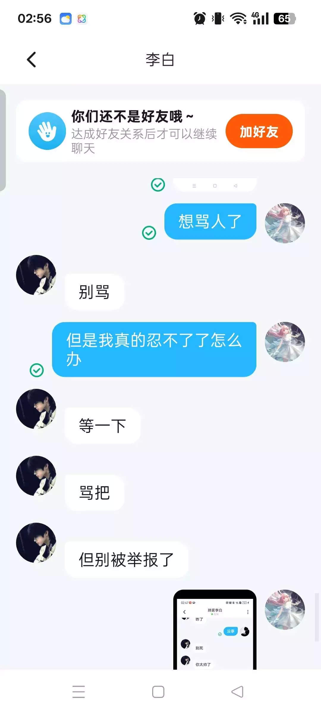 好生气真的,当时刚刚和他们接触感觉很好,但是我好傻,他们先吵的架我当时为什么要管呢,我如果不会多管闲事应该就不会这样子了,但想想,我遇见他们就是我一生中的不幸,真的是不好的一跳
