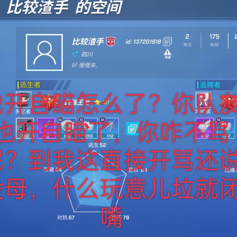 打不过就骂,单挑输了,直接取关,五把全输,看见请举报,谢谢^ω^