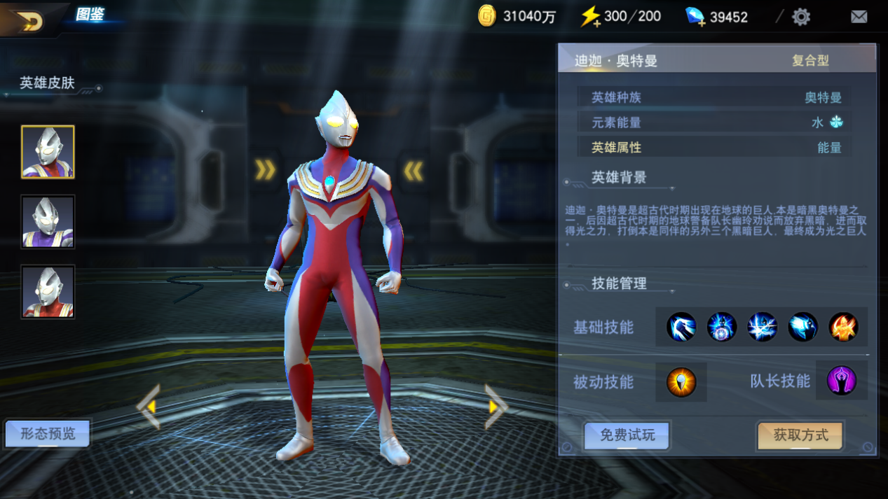 迪迦是超古代巨人,原本是暗黑系奥特曼,后来放弃黑暗,获得了光之力,成为光之巨人,迪迦是一个史诗级角色,主打角色属性是能量,但是和红莲火焰不同的是迪迦有三种形态可以切换,速度型、力量型、均衡型,所以迪迦是一各项属性比较均衡的角色,可以说是团队里的中流砥柱。