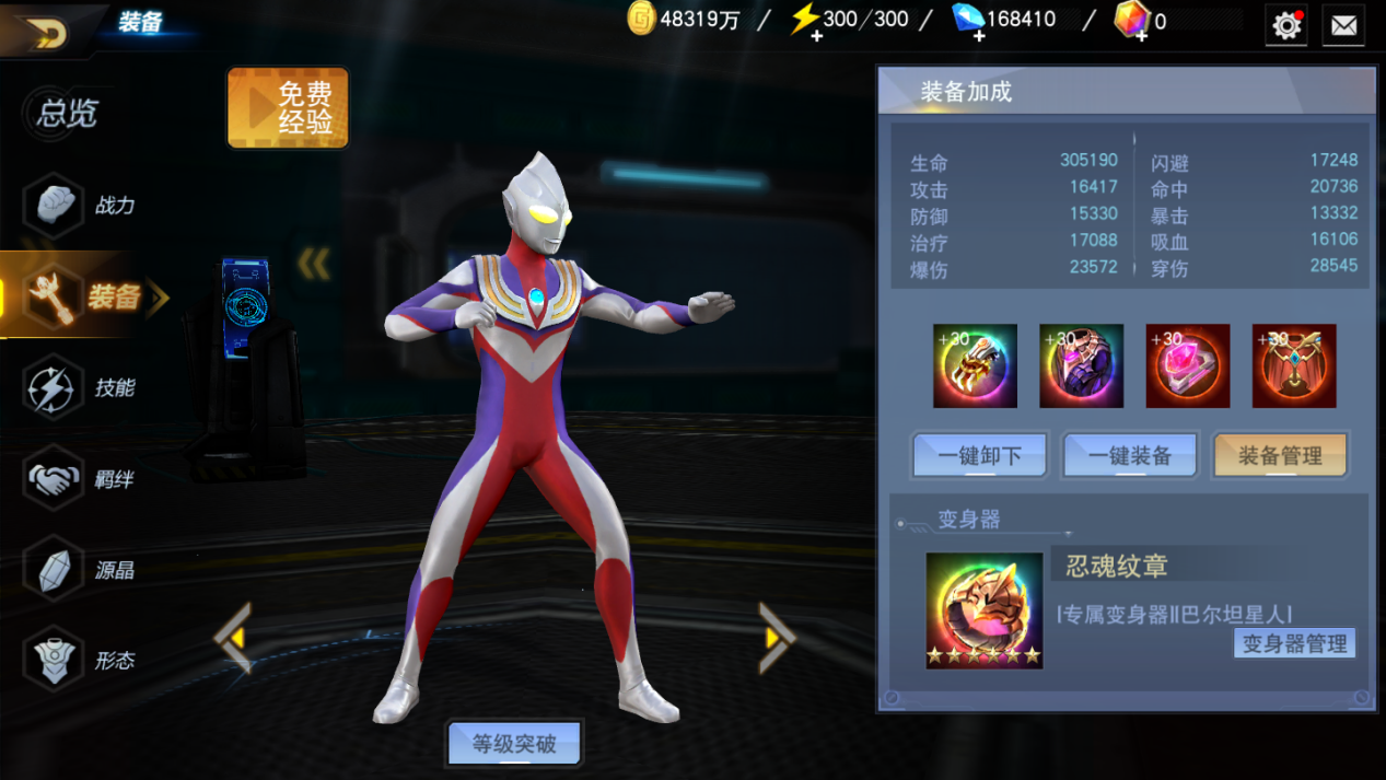 其次是装备。每个角色可以装备四种装备和一个变身器,可以获得各种属性加成如攻击、防御、生命等等,变身器也是如此,但是变身器会给角色提供一种特殊属性,而且最高级的专属变身器还能够提供一个主动技能,玩家可以在战斗时释放,CD为60秒。