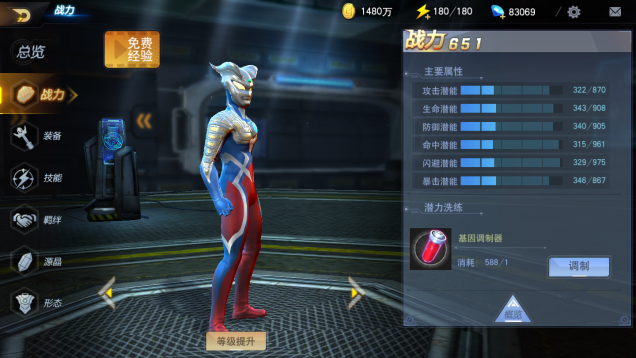 首先是潜力属性。每个角色都有潜力属性初始值和上限值,这两个值决定了角色的主要类型,例如迪迦的攻击、暴击属性的初始值和上限值都很高,但是生命、防御属性的初始值和上限值比较低,这说明迪迦是一个输出型角色。
