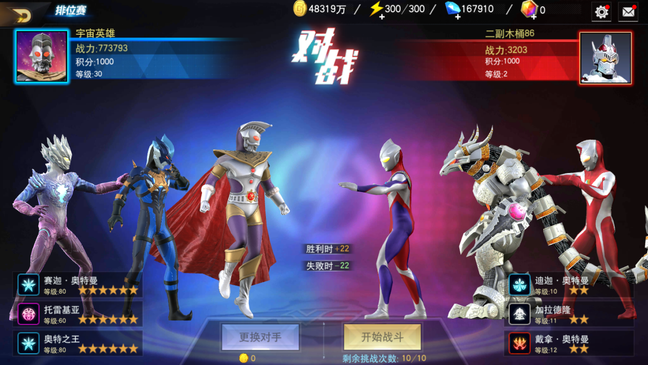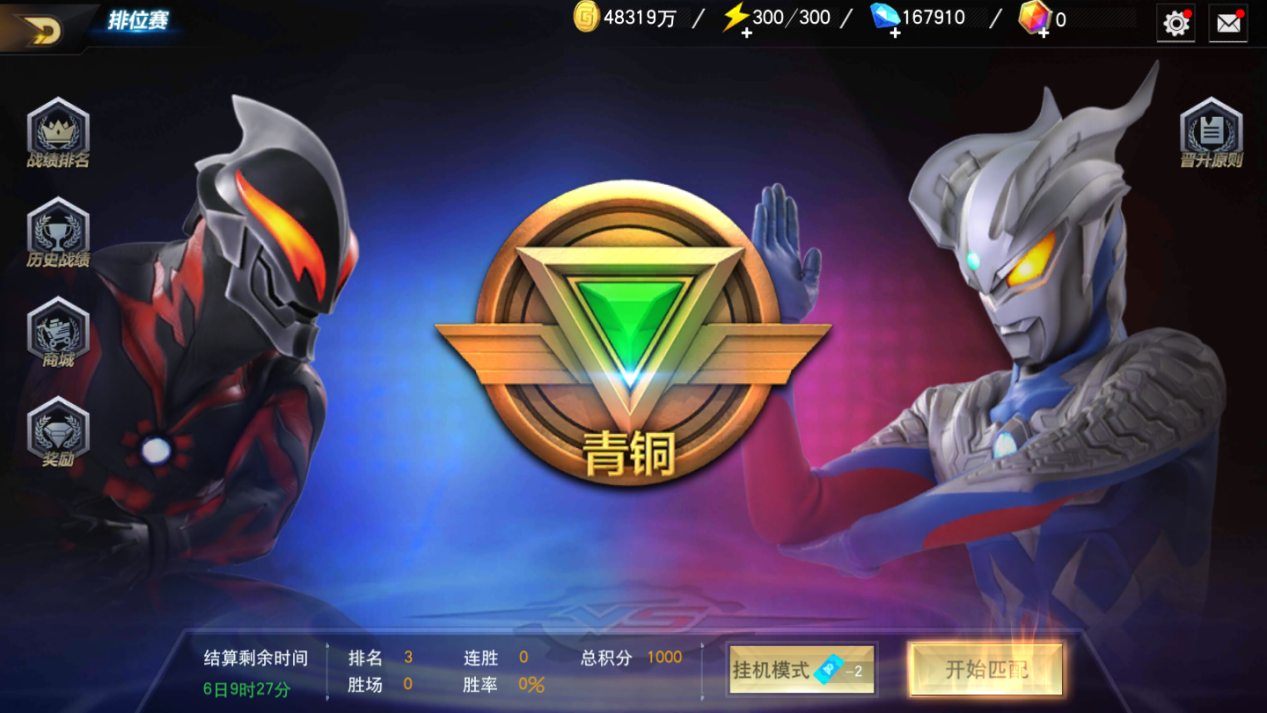 在《奥特曼宇宙英雄》中除了充满未知的PVE冒险玩法以外,还有很多玩家喜欢参与的PVP竞技场玩法,是因为在竞技场中更能让玩家感受到自己与其它玩家的差距,以及让玩家享受到与其他玩家PK的刺激,最重要的是,竞技场中设定了丰富的奖励,玩家可以在其中获得很多资源,本期攻略就给大家进行一下宇宙英雄中竞技场玩法的详细介绍吧。首先竞技场分为两种模式,一种是1V1排位赛,一种是荣耀之战3V3。1V1排位赛,顾名思义就是一个打一个,更简单的说法就是单挑,玩家进入洁面后就能看到自己的段位,每一位玩家的段位都是从青铜开始,等级依次是青铜、白银、黄金、铂金、钻石。 段位每周结算一次,结算时玩家需要让自己的排名保持在同段位的前20%,才可以进入下一个段位,如果玩家在当前段位所有玩家中排名最后20%,玩家就会在结算后下降一个段位。不过青铜段位是不会掉段的,而钻石段位也不会升段了。玩家点击开始匹配后就能进入对战详情页,这里显示的就是玩家自己的信息与对手的信息,左边是玩家自己,右边是匹配到的对手。整个界面会显示战力、积分、等级、出战角色信息,玩家可以在这个界面观察对手,分析对手和自己的实力对比,决定要不要挑战当前对手,实力对比有很多影响因素,首先就是战力,这个是一眼就能看出来的,如果敌人战力超过己方太多,肯定是要果断换对手的,战力对战局的影响是最大的。 其次看双方出战角色的星级等级,星级等级越高的角色,战斗力自然也就越强,如果敌人拥有一个高星高等级角色,而自己没有,那就需要考虑要不要跑路了,而如果敌人没有这种角色,而自己有高星高等级的角色,那么不用犹豫直接打就好。总的来说,打与不打都是由玩家自己决定的,胜利会增加积分,失败则减少积分,需要玩家三思而后行。接下来说一说3V3玩法,这个玩法稍微复杂一些,玩家每天都可以进行挑战,但是每日失败三次就不能再继续挑战了,玩家累积胜利十次后也不能继续挑战了。玩家可以根据胜利的场次领取对应的奖励。每周末开启荣耀之战,玩家可以一直进行挑战,直至玩家没有角色可以出战为止。结算时会根据玩家的胜场排名发放奖励。在这个玩法中,玩家出战的角色必须是40级以上的,每个角色拥有3点疲劳值,每战斗一次消耗1点,消耗完后无法继续出战,角色战死后也无法继续出战。这个玩法的战斗方式是团战,双方三个角色一拥而上战斗,玩家只能操作自己队伍中的一个角色,打起架来的场面还是挺混乱的。 在这种玩法中有一个小小的技巧,首先是自己出战的角色不能是三个最强的,这样打完三次后就无法继续胜利了,一般玩这个模式都是一个厉害角色搭配两个战力低点的角色,这样在角色充足的情况下可以保证9场胜利。当然玩家需要对自己的角色充分自信,确定自己的一个厉害角色可以打得过对面三个角色才行,这种玩法是不知道对手是谁的,有可能匹配到高手,也有可能匹配到新人,是有一定运气成分在里面的。两种竞技场玩法的侧重点是不同的,1V1考验玩家单个实力的强度,如果角色够强,1打3是绝对没有问题的。3V3考验的是玩家英雄的数量和强度,只有单个角色强或者培养的角色多但是没有一个特别强的,都无法在3V3战场中获得不错的战绩。 在游戏前期,玩家也不需要考虑3V3竞技场的奖励,只需要努力培养自己的角色,在1V1竞技场中展现实力就行了,成长总是需要时间的。本期攻略内容就这么多了,大家对竞技场玩法是不是已经有了一定的了解和目标了呢?希望大家早日在竞技场排行榜中名列前茅!