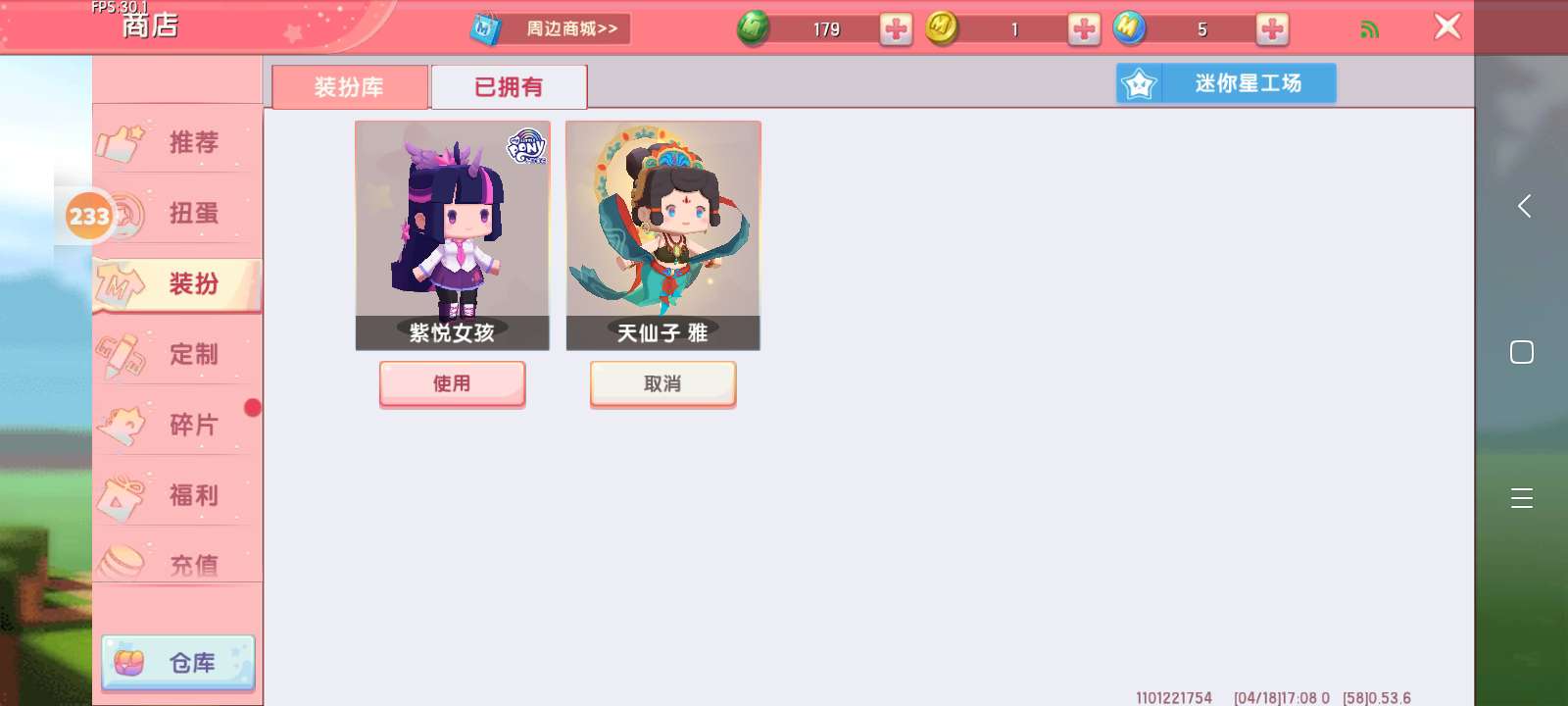 有两个皮肤:紫悦女孩(限定皮肤),天仙子雅(五周年限定皮肤)