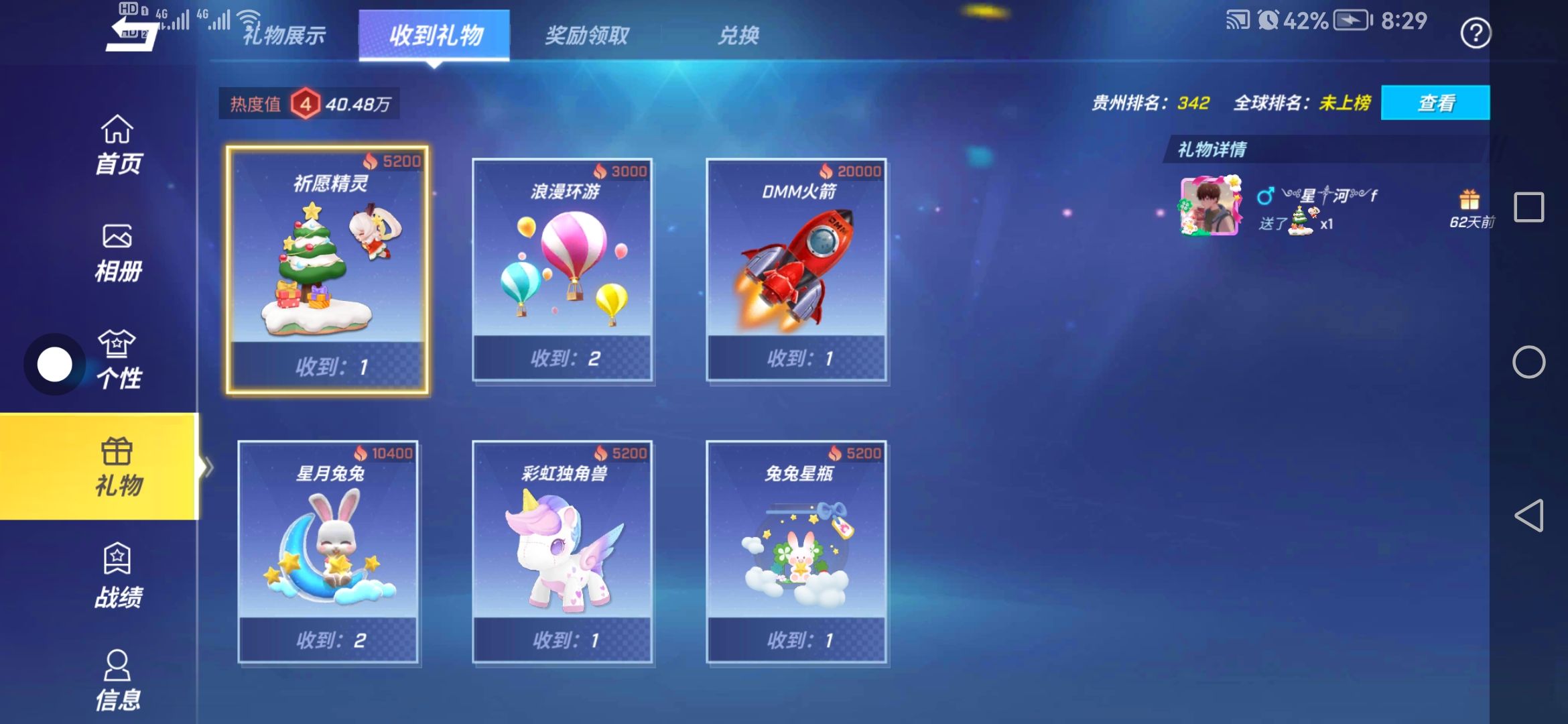 我的礼物不是很多,在贵州排名也就342😢😢