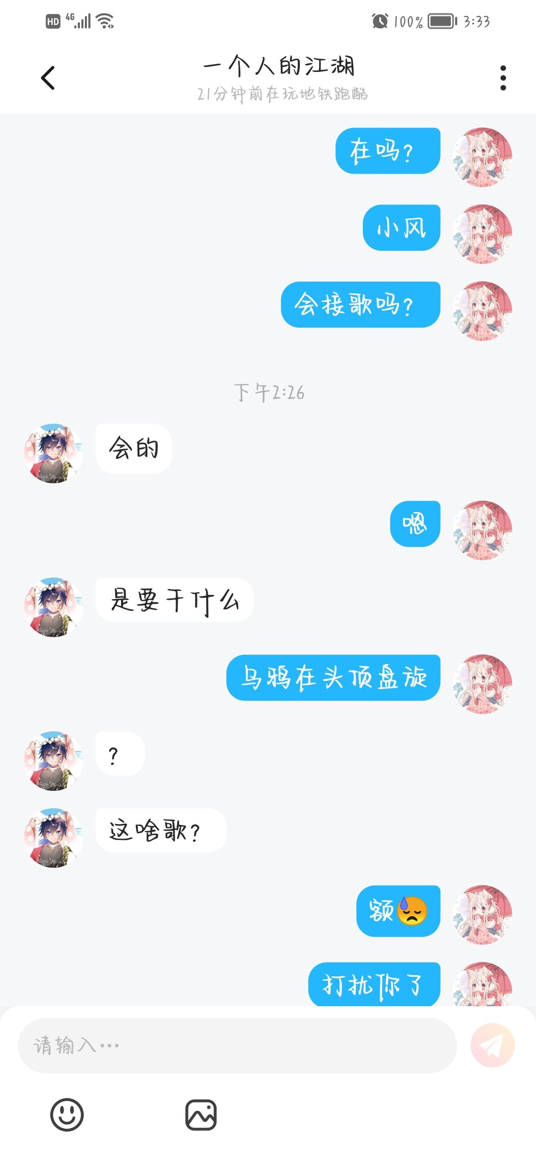 和小徒弟接歌,有想接歌的可以加个好友吧!希望可以接上我的(乌鸦在头顶盘旋)吧!