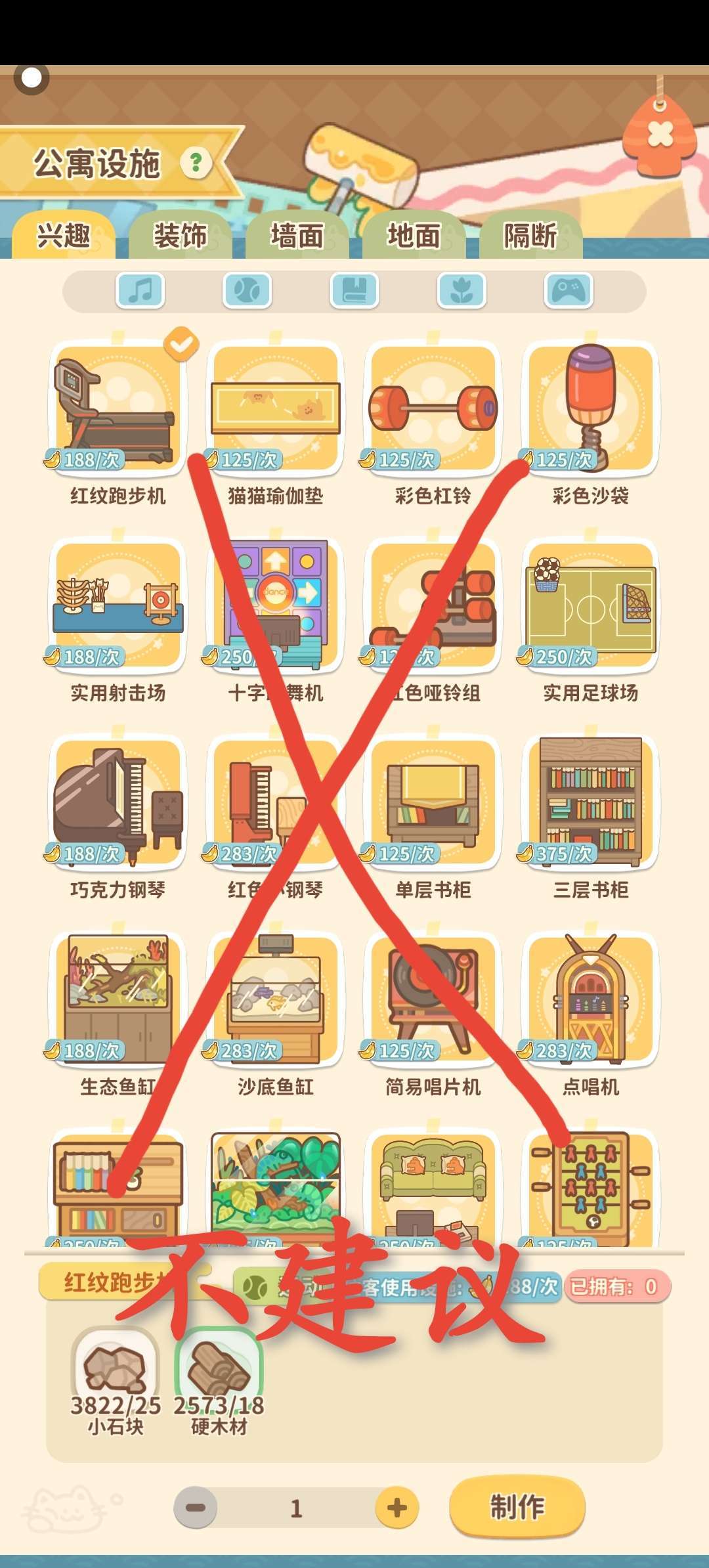 首先是兴趣类设施,不建议多放最好只要放一个就行,因为兴趣类设施产生金香蕉的方式是住客使用之后,便会产生一次使用后的金香蕉数量。