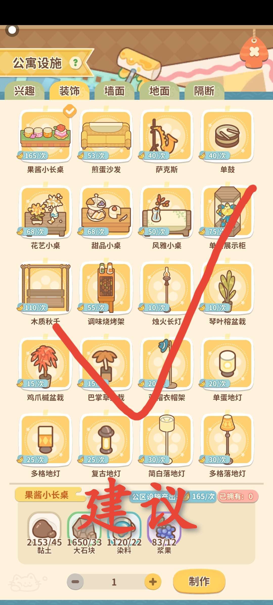 之后就是来源于大厅摆放的设施所产生的金香蕉了,产生金香蕉的一共有两种设施,一个是兴趣,一个是装饰(为什么分开讲?主要是因为两种设施铲出金香蕉的方式不一样)