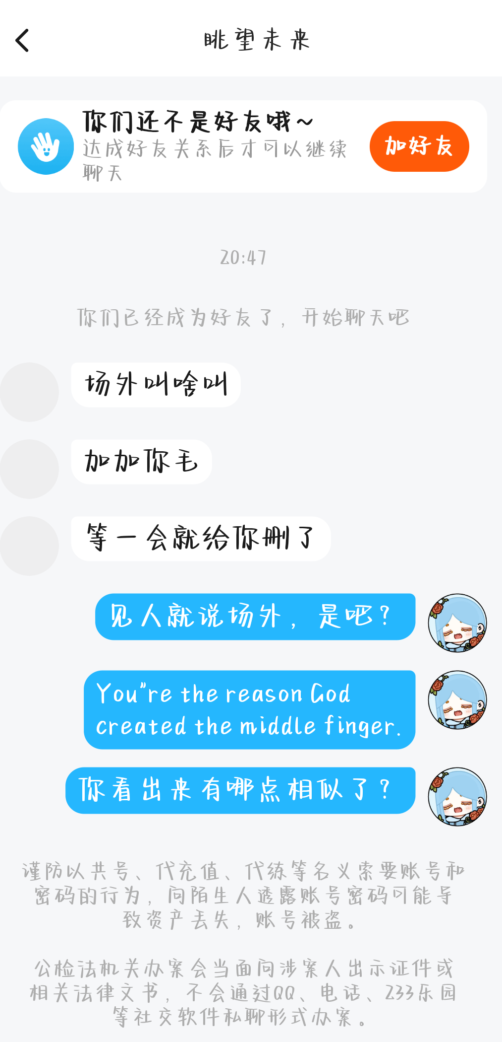 我和另一个人玩的好好的,他就突然说我们两个场外我们两个衣服不一样,名字也不一样,他非要说我们两个场外。还说我叫什么叫?