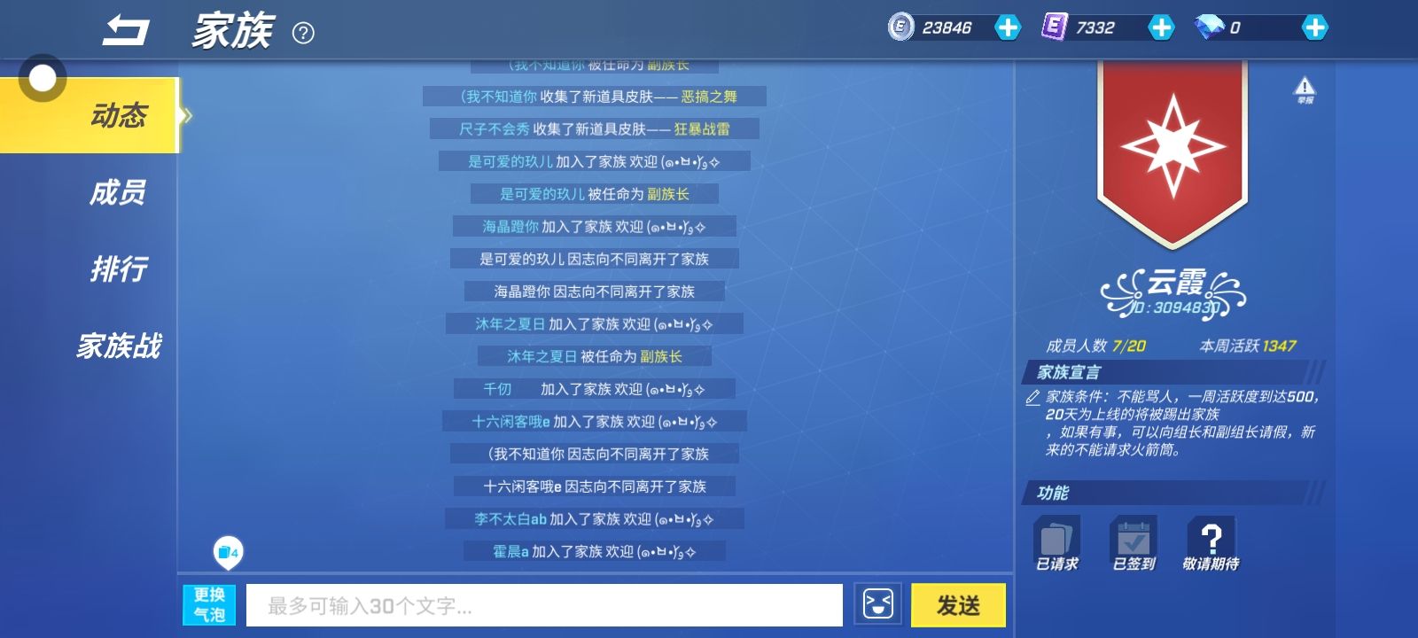 来我家族,条件不多,只要是王者就行,刚来的不能请求火箭筒,积极捐卡,要来我家读的,先加我,195954304