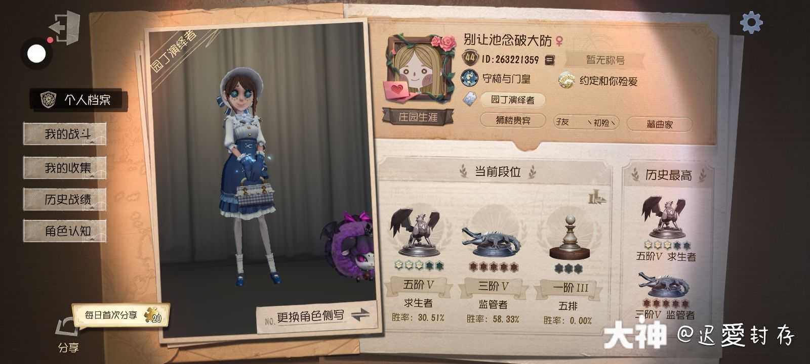 d固玩,主玩牵制和辅助,牵制主玩园丁,辅助玩小女孩,救人玩记者,属于又菜又爱玩,脾气还行,心态不算特别好,看上直接加好友