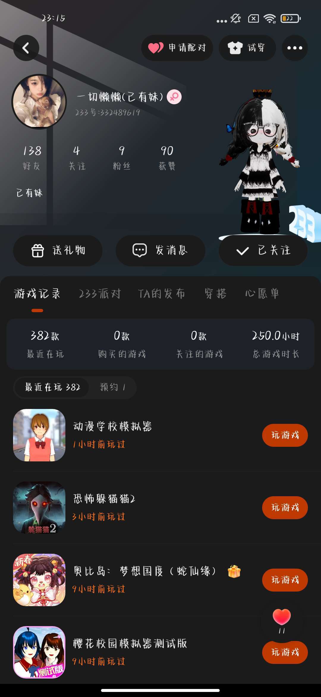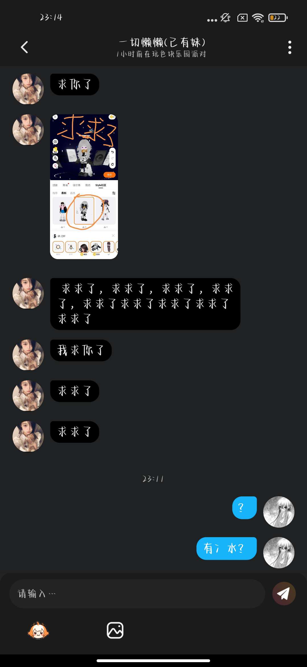 她说行 第2天我就说我不要了 因为我怕她骗我 然后我说完就删了嘛 然后刚刚在玩刀刃球的时候遇到她了 然后她就说她认识我 然后那个时候他改名字了我就不认识她了 不过一看到这个头像我就想起她了 不过我怕认错人就先没问她 然后我跟他聊了几句我就问她你是不是叫林妹妹 然后她说是 然后她让我加她 然后我说不交友 然后她又说了一句我加她这一类话 然后我就重复了和上面一类的话 然后她就已读 然后我问她 已读是没话说了吗 然后她还是已读