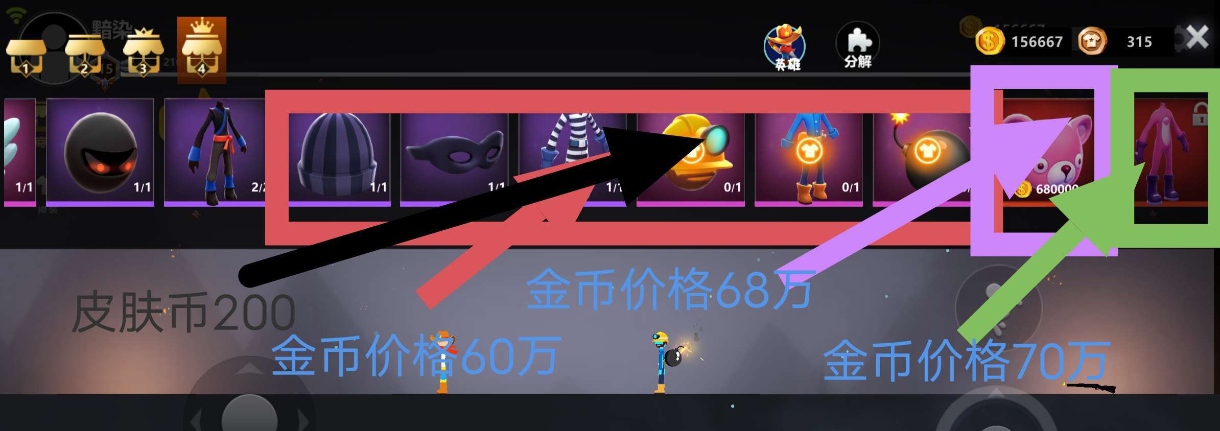 已完结,随便问如何判断游戏人机,通常游戏人机都是一样的玩次数多了就能分辨,黄色是跑的最快的,笑脸头像的都是人机,人机分别为黄色,蓝色,绿色,还有个红色被官方隐藏了,主页玩偶就是作者当时用的皮肤当你分解了皮肤币时它不会显示,但是确实是获得了没有私吞也没有bug,退出游戏重进后就能看见多出来的皮肤币了除了能选择的那几个皮肤颜色外,还有一个肤色和肤白色被官方隐藏了,仔细看那个黑暗领主和林之妖怪套装后你就会发现黄金宝箱是有抽奖次数的,当到达次数它会显示五秒结束后可继续抽奖,无用的小设定黄金宝箱的抽奖几率,红色品质的几率%4-5,粉色品质的几率%9-10,紫色品质的几率%30-40,蓝色品质的几率%55,绿色品质的几率%80-90,隐藏绿色品质几率%0.25,皮肤币5-10-20几率%1,皮肤币30几率%0.67,皮肤币50几率%0.41,皮肤币100几率%0.30白银宝箱的抽奖几率,红色品质的几率%1,粉色品质的几率%4,紫色品质的几率%8,蓝色品质的几率%12,绿色品质的几率%21,普通品质的几率%33购买皮肤的时候看广告会给你返回金币,系统设置是根据商品价格返回的数量,价格越高返回的金币越多,不过必须看一个广告其实有很多服装都是有特效的这得你自己去观察其实这个游戏在233是有另一个版本的叫做《格斗火柴人》材质不一样算是二改,搜索就能找到有的时候网络不好就会导致游戏出现bug,比如人物不死,和卡在空中动不了等情况,如果到后面还是网络很卡那么游戏结束的时候就不会给你积分和金币游戏中获得的1分就等于45经验和和1167个金币,普通的一局最大255经验,8000金币,所以达到一定数量就不用打架了,模式就相当于积分x了一倍或者是四倍