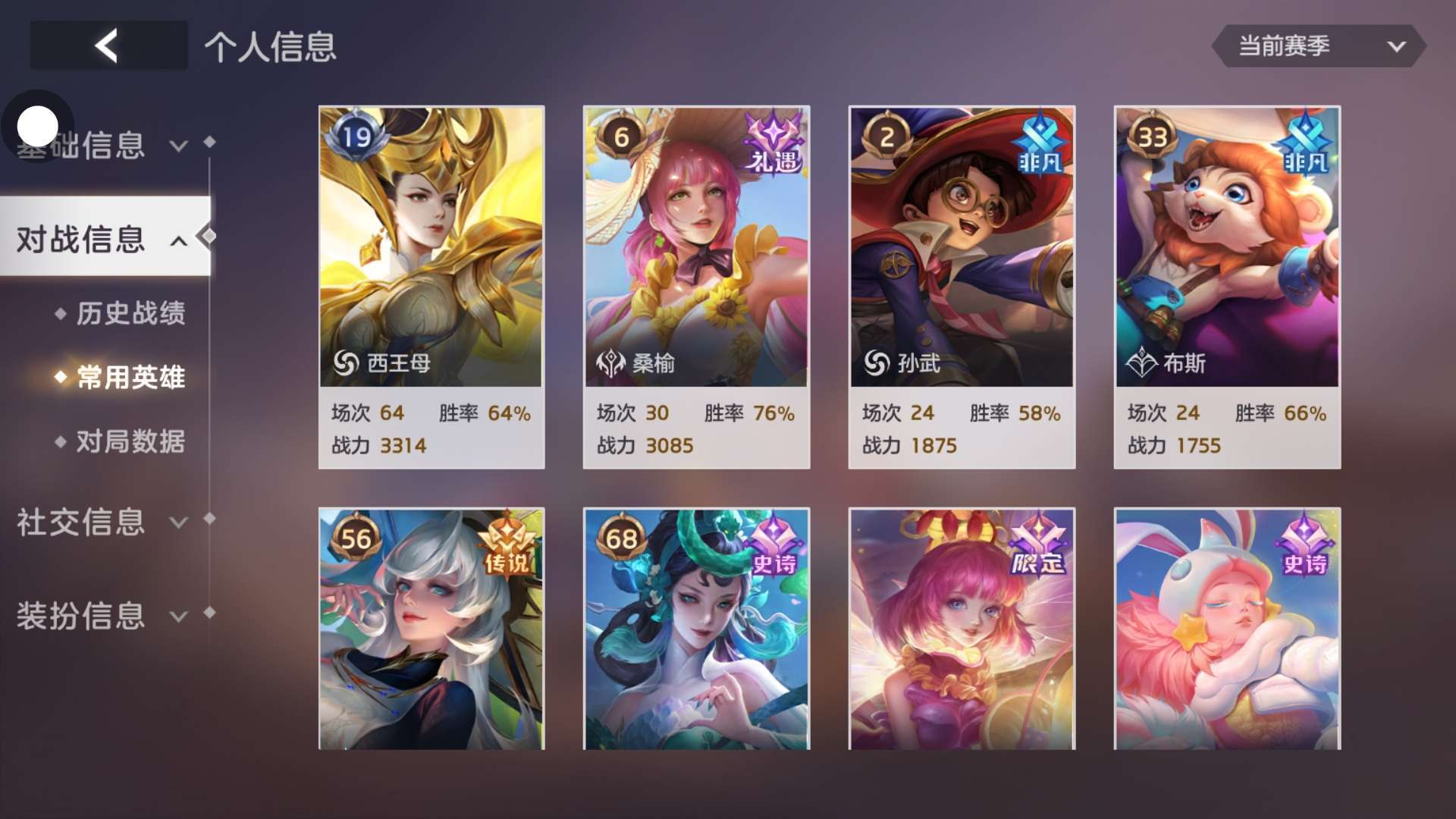 胜率为零的梅朵,胜率为零的昭君,20多的西河,25的锡纸,25的蓝,25的梅林,20的黄月英,33的阿尔忒弥斯...帅到我了