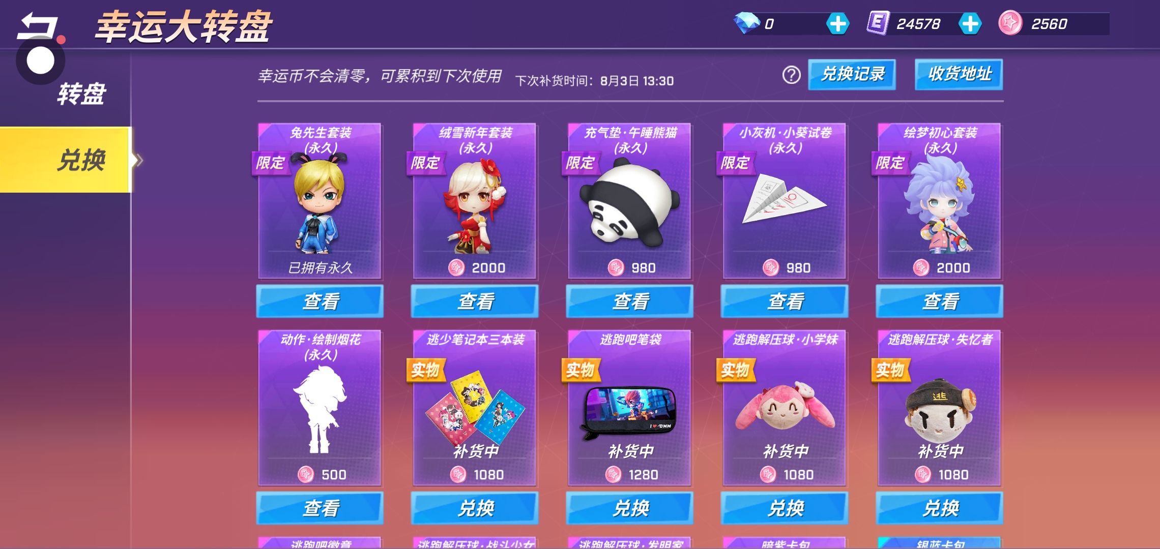 兄弟们,兔先生搞到了,还剩2560幸运币,要兑换什么才好
