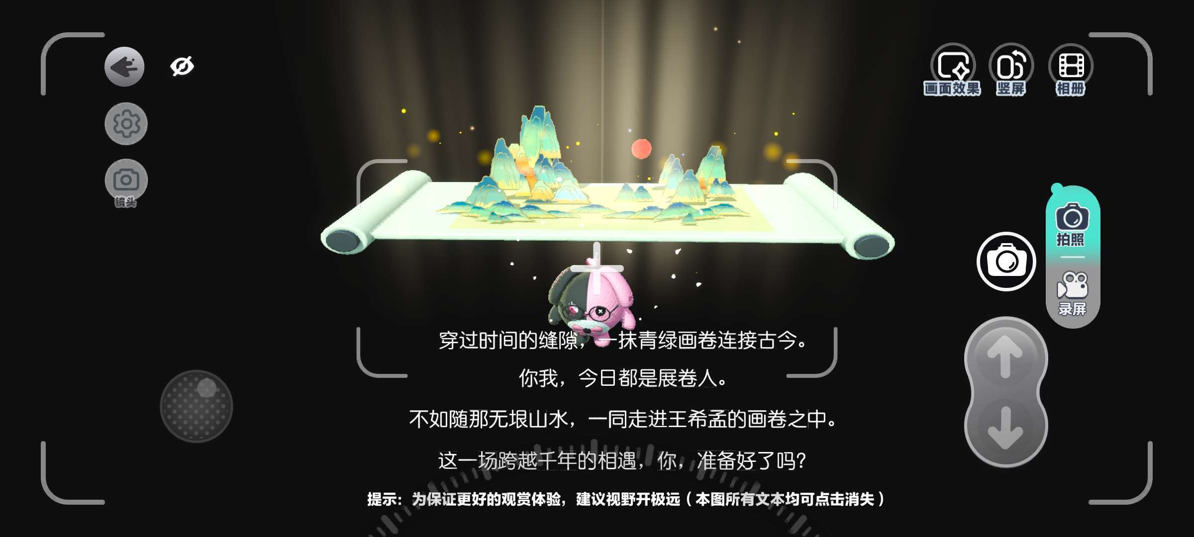 第三回合结束后,走过石路可以看到一位女子在亭子里休息,根据提示:轻触碰女子,即可入画(进入后会有集存档点)接着可以看到千里江山四个字,走进去