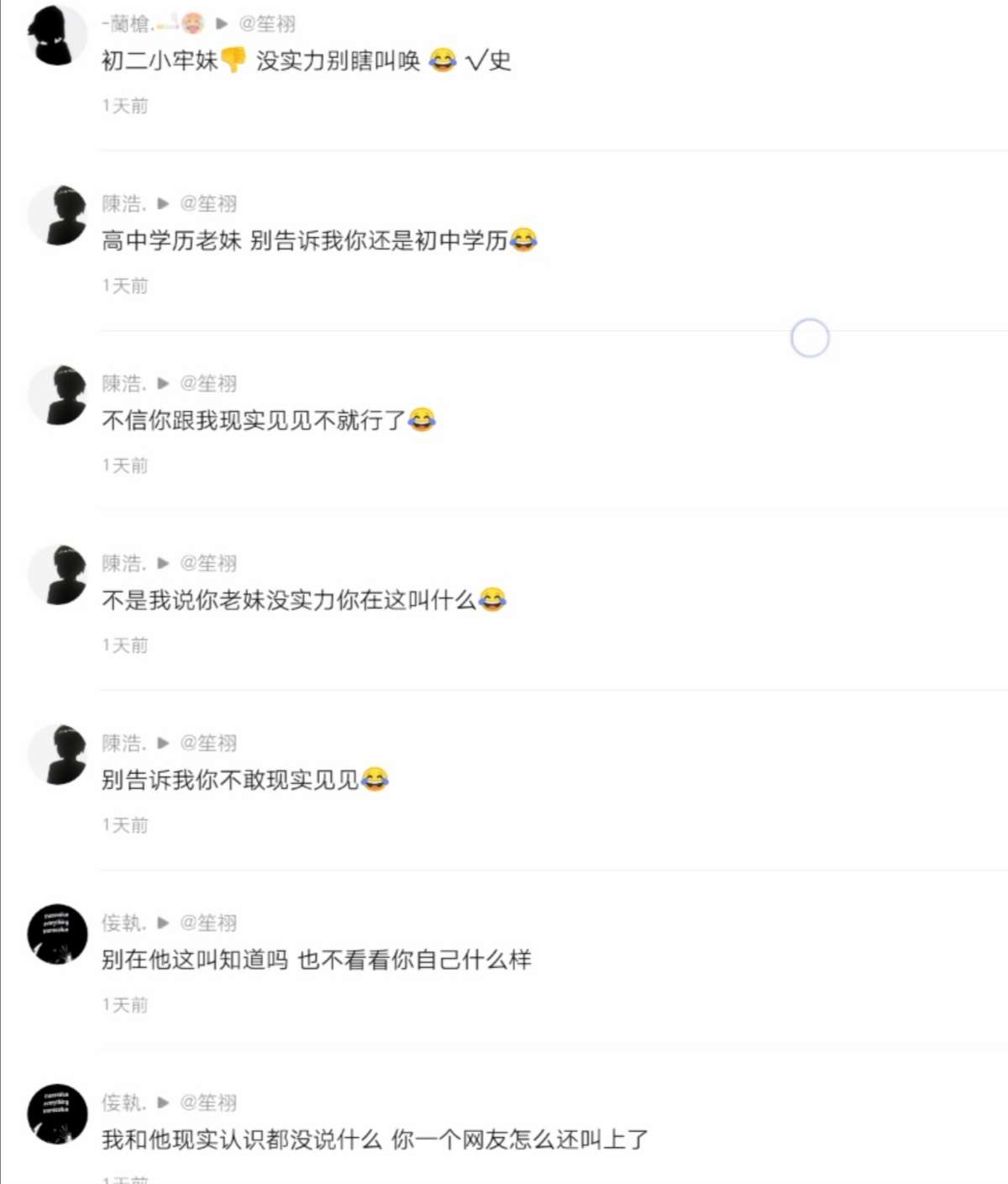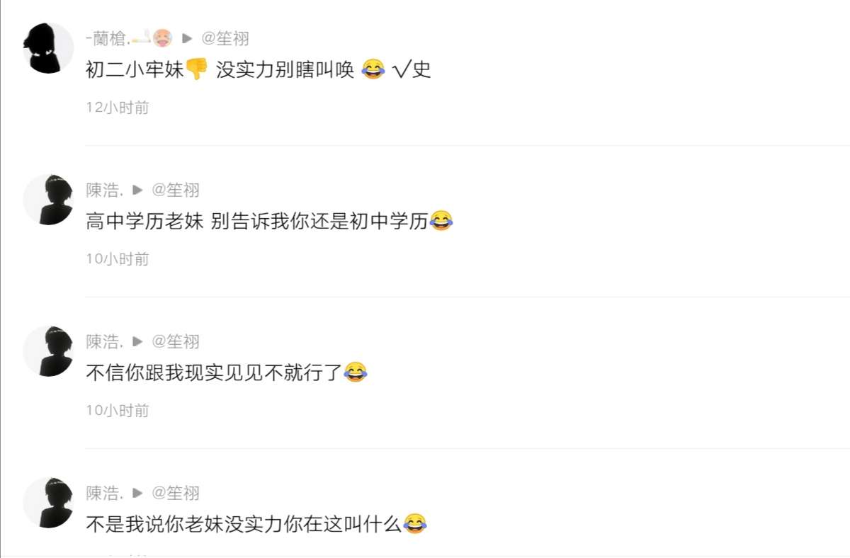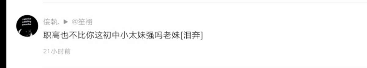 还要跟我现实碰,现在人都没了,自己也承认是职高的了,我也无话可说,临走前还骂我两句😱被你们骂怕了,现在还约我,真拿自己当职高的了,也许是屎粒小学生
