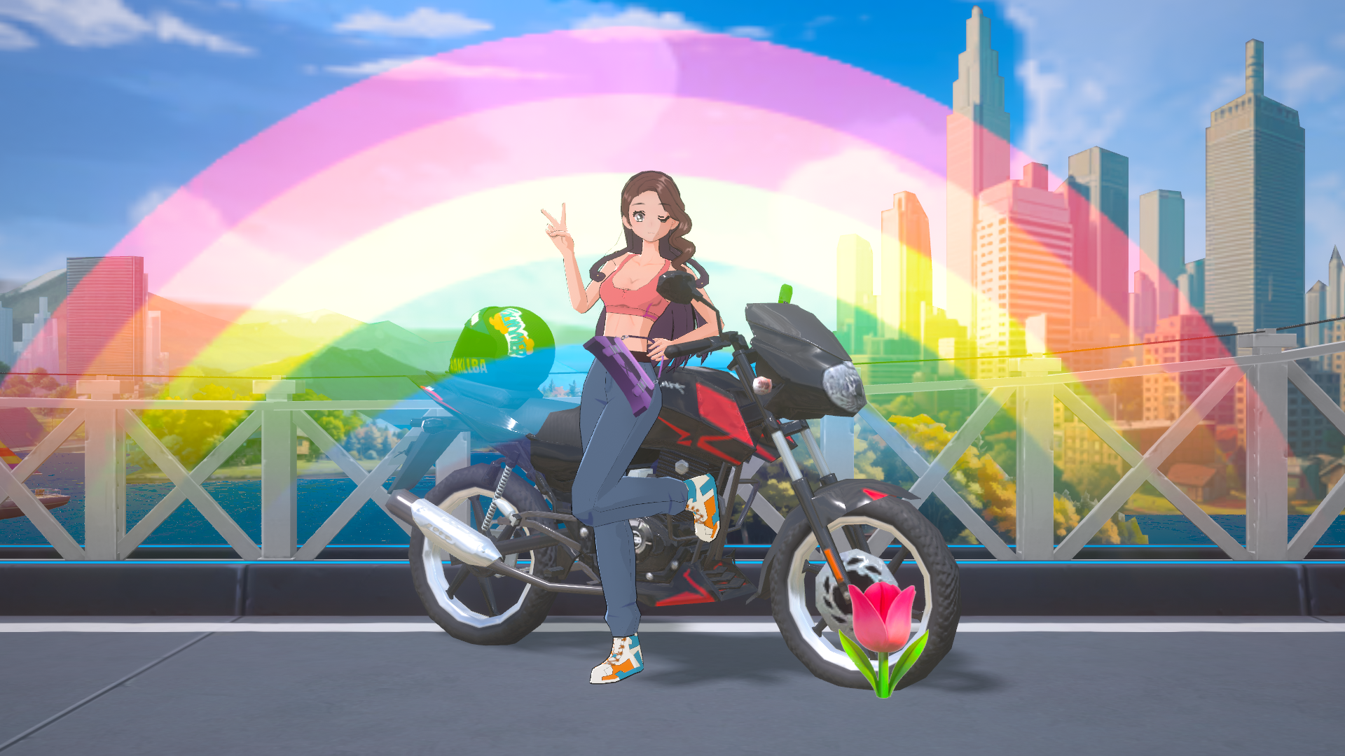 快乐的女孩儿骑着摩托。
