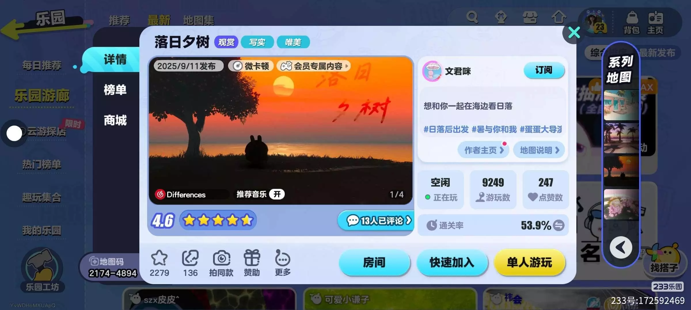 hello!大家好,这里你们的🌈妍𡛁。今天为你们带来一张蛋仔地图。《落日夕树》📸类型:观赏丨写实丨唯美地图名:《落日夕树》通关率:53.9评分:4.6推荐指数:⭐️⭐️⭐️⭐️地图码:2174-4894作者大大:文君眯黄昏时分,《蛋仔派对》的这片乐园海域被染上了浓郁的橙红色调🌅。天空💐像是被打翻的颜料盘,从天际的深红逐渐晕染开橘橙,直至与海面的金黄融为一体。海面波光粼粼,仿佛揉碎了无数片金箔📸,在微风里轻轻晃动。💿 岸边的孤树以剪影的姿态伫立🌲,枝桠在暖色调的背景下勾勒出清晰的轮廓,平添了几分孤寂的美感。一只卡通热气球悬浮其间,燃烧的火焰为这静谧的黄昏增添了一丝灵动。吊篮里的蛋仔角色,(๑Ő௰Ő๑)在暖光的映衬下更显可爱,手中的蓝色光效仿佛是这浪漫景色里的一抹点睛之笔✍ 整个场景将童趣与自然之美完美融合🎨,游戏界面的各类功能按钮若隐若现,既保留了游玩的互动感,又丝毫没有破坏这黄昏海景的诗意💘,仿佛在邀请每一位玩家停下脚步,沉醉在这片刻的温柔与绚烂之中😘黄昏时分🌇,这片海域被浓烈的橙红色霞光笼罩。天空从深红渐次晕染开橘橙,一轮圆日悬于天际,将海面映照得金黄璀璨,波光摇曳如碎金铺就。岸边孤深沉的剪影姿态伫立,枝桠轮廓清晰~与蛋仔角色的可爱🤗形象形成反差,却又奇妙地融合。整个场景把自然黄昏的浪漫与游戏的童趣感交织,暖色调的渐变让画面💿充满治愈力,仿佛时间在此刻慢了下来⌨,只余这片海、这轮日、这棵树🌲,以及可爱的蛋仔,共同构成一幅温柔且富有层次的画卷🎉(。・ω・。)ノ♡黄昏时分,天际被橙红色的霞光晕染🎶,远处的山峦在暮色中勾🌈勒出朦胧的轮廓,与海面的金橙色光影交相辉映。地面上,一盏小灯散发着柔和的光📸,蛋仔角色身旁的蓝色光效点缀其间。整个场景静谧而富有层次感,暖色调的天空与暗色调的地面形成对🎀将黄昏的氛围感拉满📽,仿佛时间在此刻沉淀,只余这片山海与可爱的蛋仔😇,共同构成一幅治愈且富有诗意的画面~总结: - 画面元素:一棵孤树,背景是日落时分的海景,天空呈现橙红色渐变,太阳悬挂在天际,海面波光粼粼。- 游戏界面:左侧有复位、拍照、购物等功能按钮,右侧有文案、传送、屏幕、阴影选项及角色动作按钮,🎨显示这是游戏内的互动场景。|ω・)- 场景风格:延续了《蛋仔派对》萌系、童趣的风格,将卡通角色与浪漫的日落海景结合,打造出富有氛围感的打卡点,供玩家→←观赏和互动。#申请精华 #申请初级班#今日份OOTD #蛋仔共建没#蛋仔美图#我爱子七#申请月榜#申请精英团(๑Ő௰Ő๑)🎉专座: @『Long乄Song』 @瑾颜 @子七来喽 @꒰ঌ忆咩໒꒱ @181秒. @初雪. @咪咪兔小可爱{暂退} @♚玫瑰[神阁] @权威洛汐 @甜辣酱