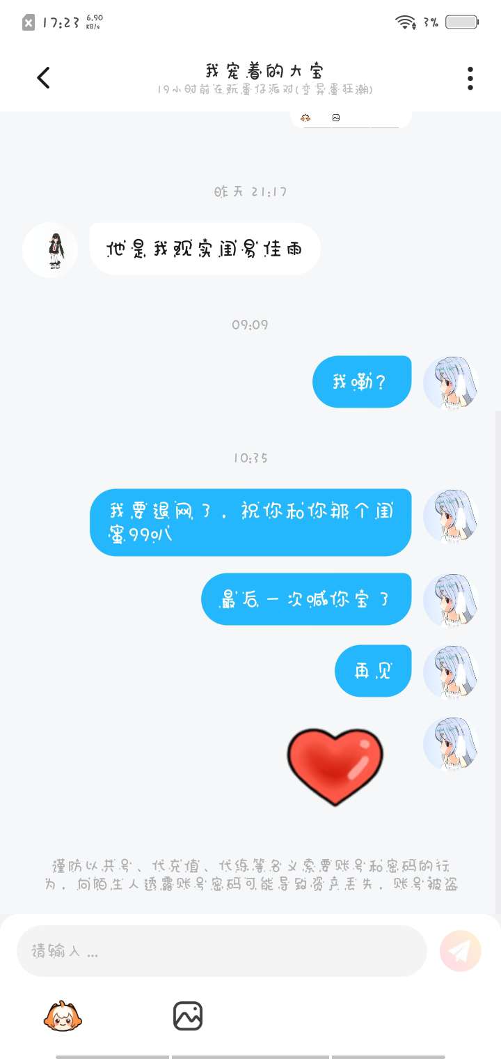 我们终究还是回不到过去了我不喜欢三人友谊三人友谊总有一个人要退出的,你跟我说。你在现实中有一个闺蜜我在写三人友谊,他们在现实中的感情特别好,而我只是一个网络上的。没有什么感情,就算有感情也不会很深倒不如祝福他们既然三人友谊,总有一个人要退出那么那个人就是我我甘愿退出你是我见过最好的人也是陪伴我最长时间的一个闺蜜谢谢你,让我在这段时间特别快乐现在也该让你和他快乐了我不退网了只是默默的祝福你们如果你想回归我的话欢迎你祝你和他久久