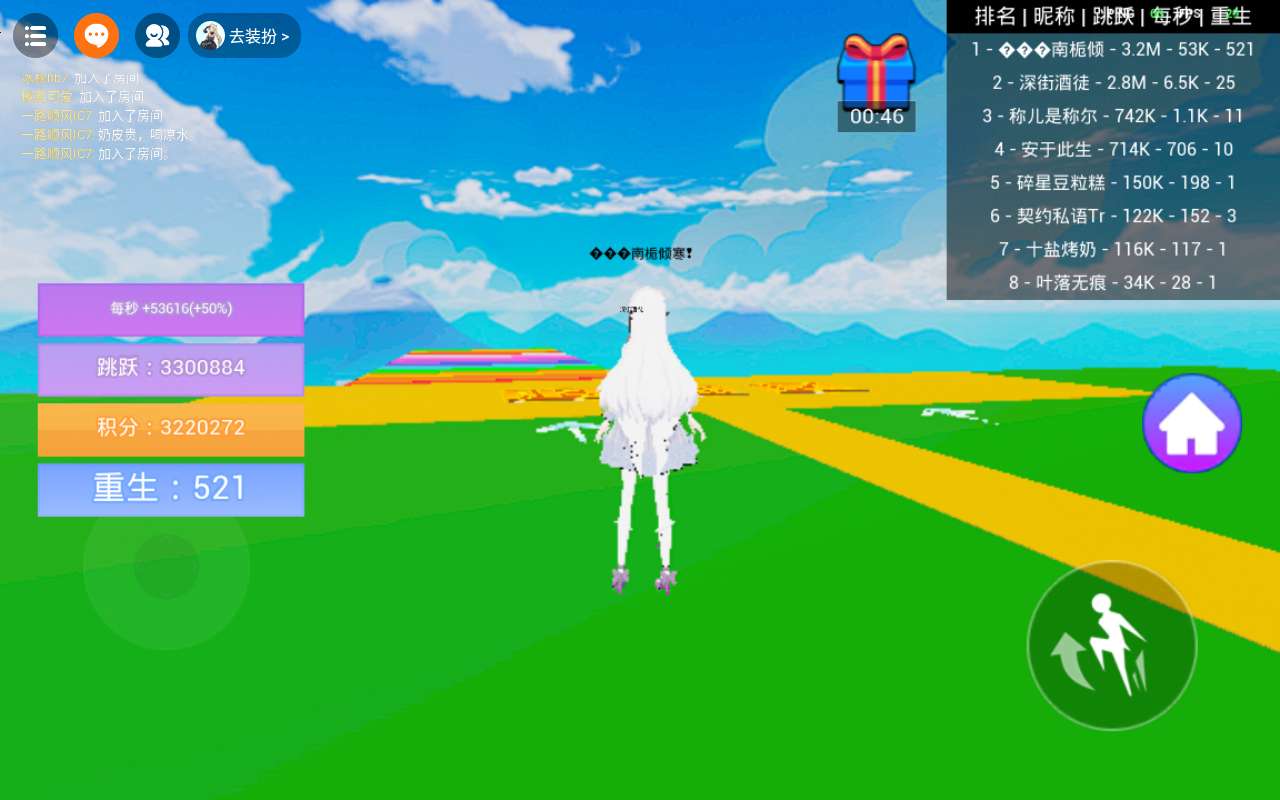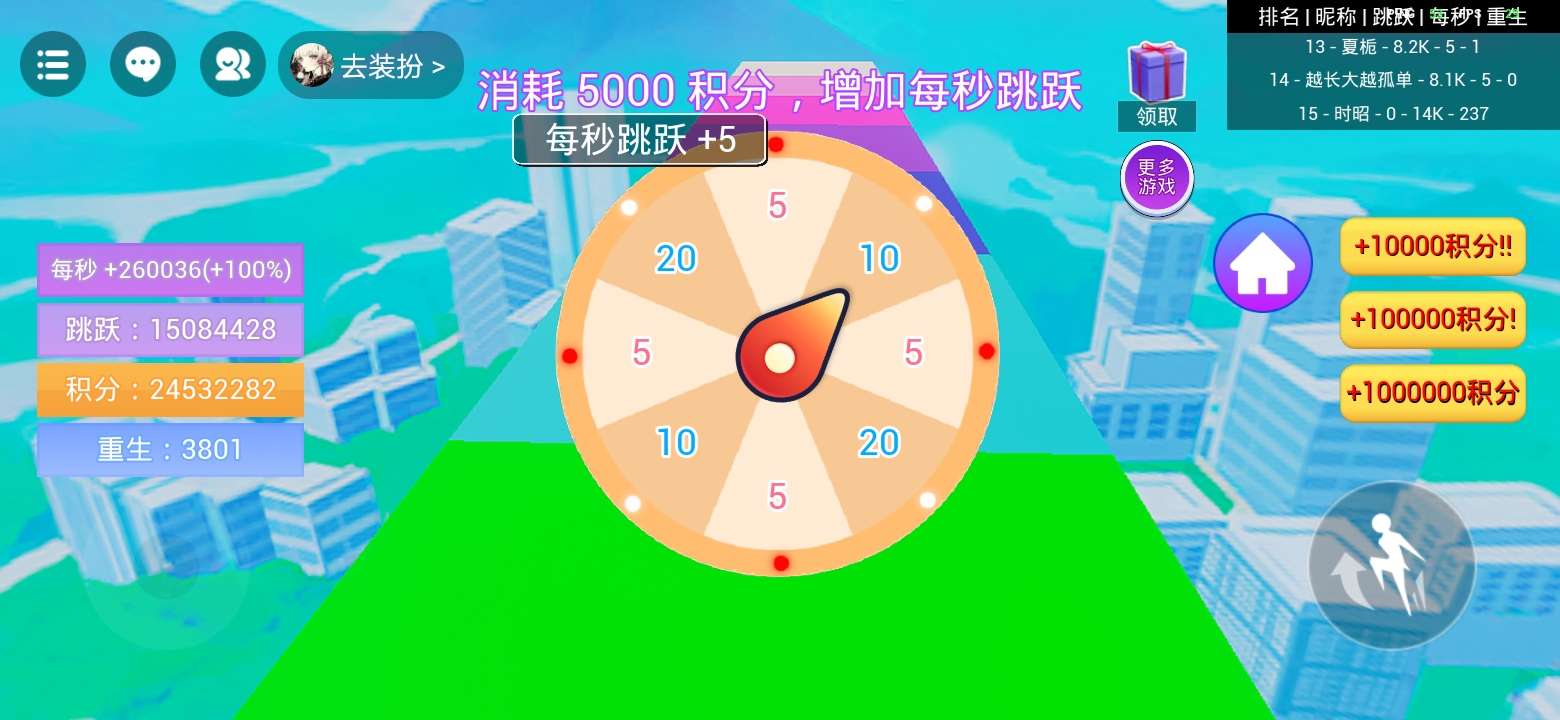 还有一件事,当跳跃值越来越高的时候,跳跃获得的积分会慢慢减少😅至于从多少才开始减少的这个我没办法测,就现在我这个数值,只有重生时再跳所获得的积分才是最大积分,第二次就开始少了