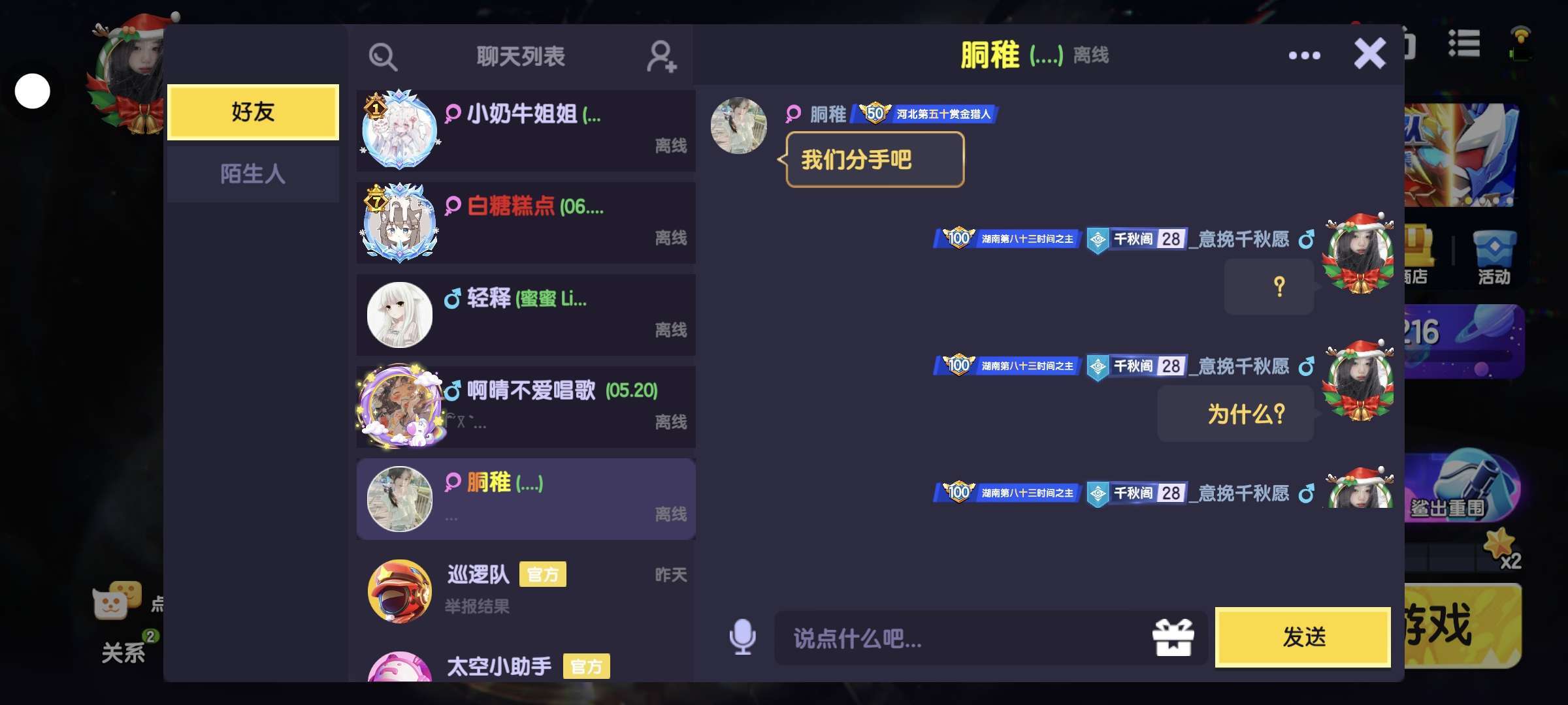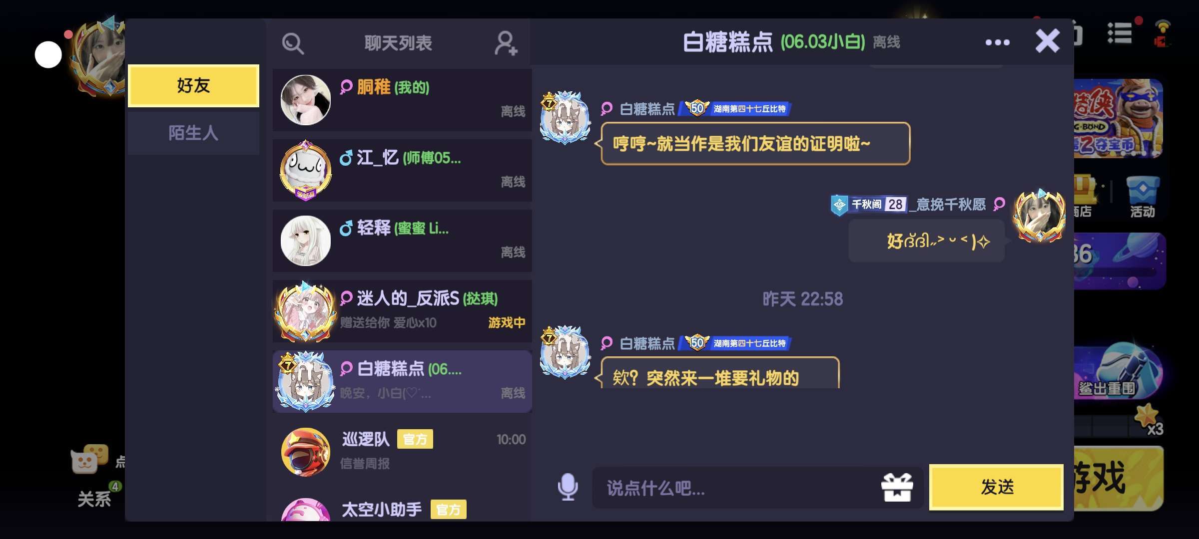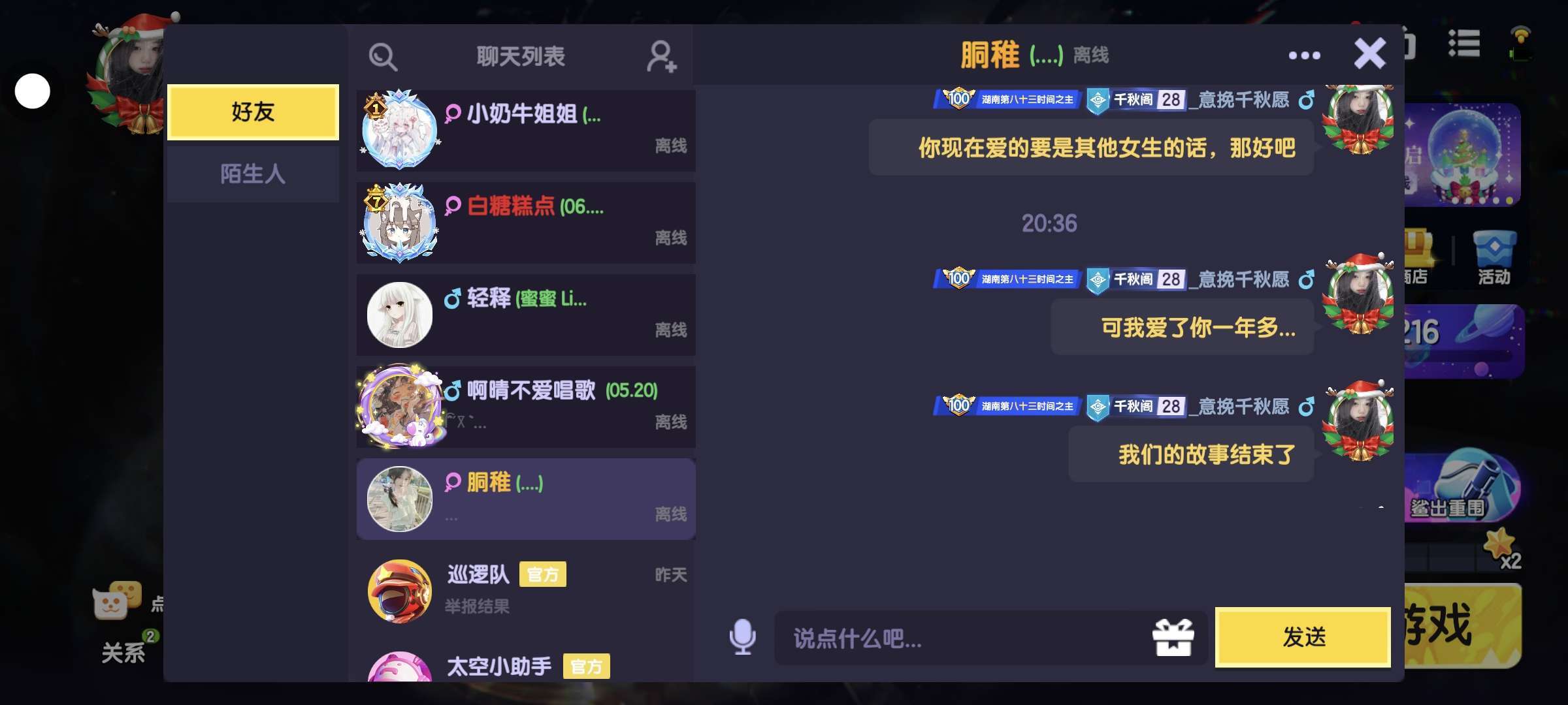 以前喜欢的那个女孩是我退游前几个月加的,退游时她把我删了,回归后还是加了回来,但到最后还是删了。现在喜欢的那个女孩,是回归后加的,那时她也回来没多久,到现在认识她也快一年半了。之前很多骂她的,我总是会私信去骂。我挺喜欢她(小琪宝宝)的。