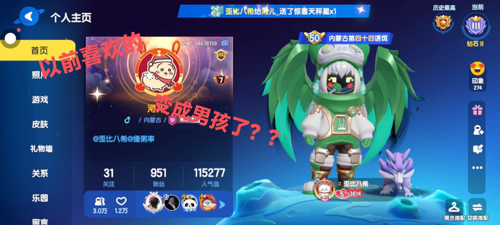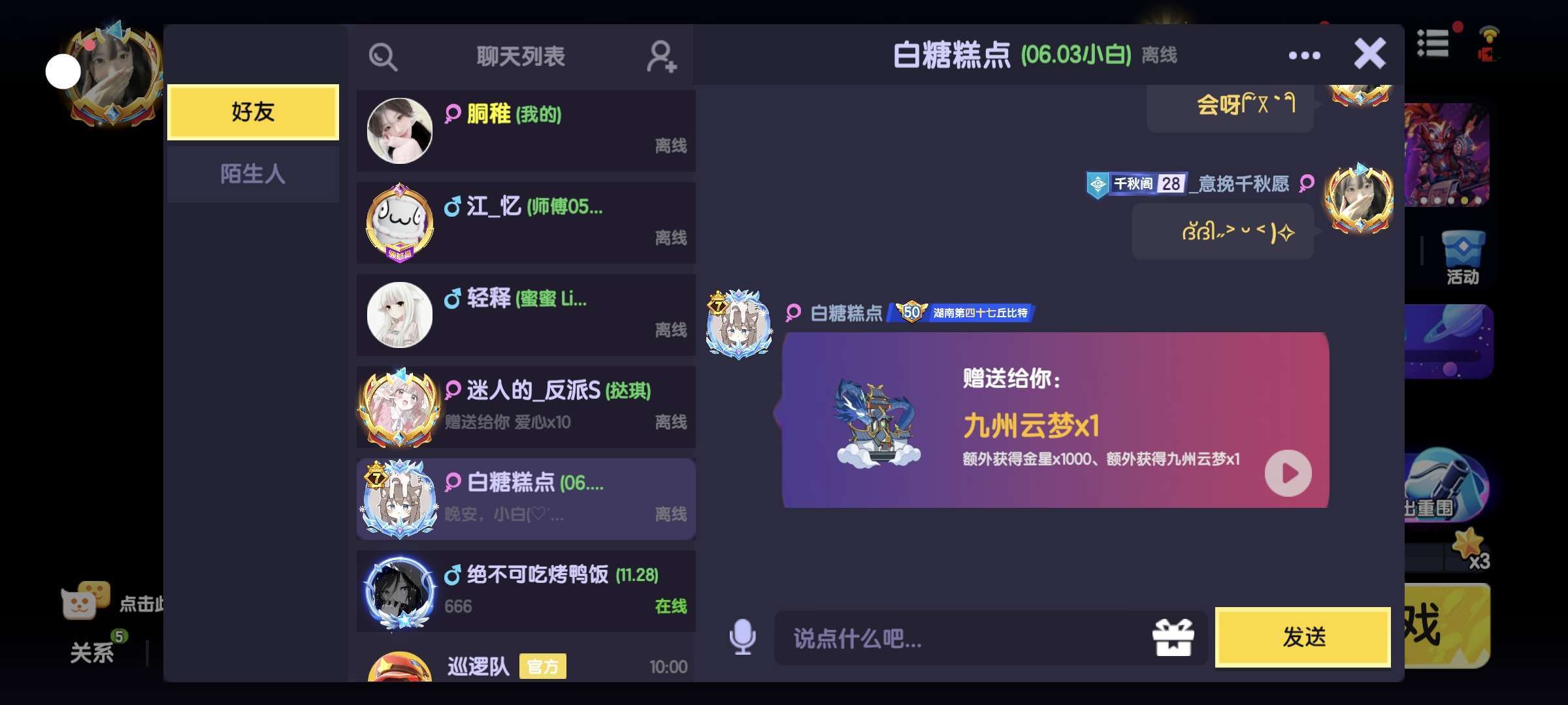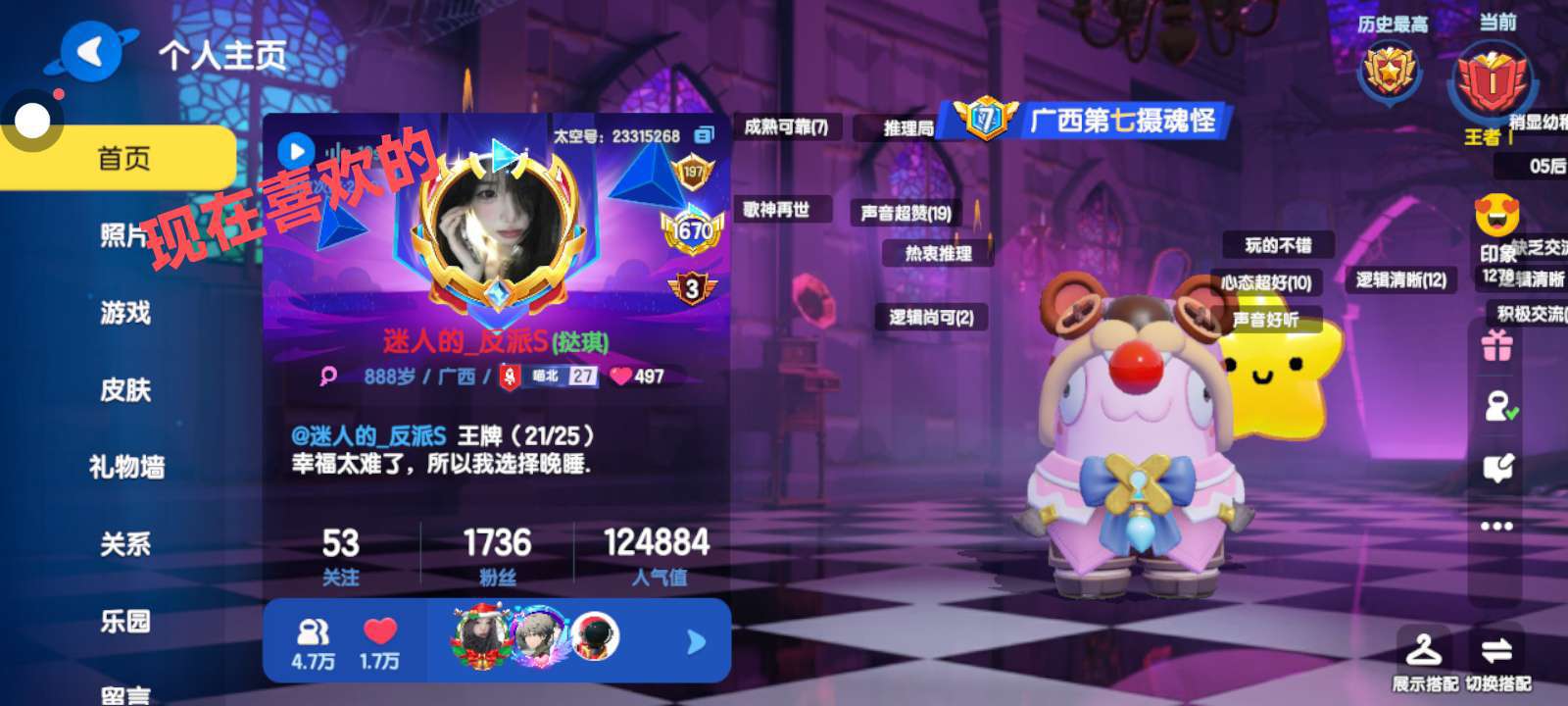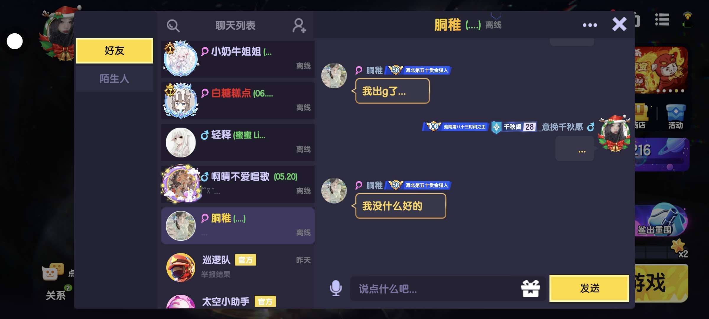 以前喜欢的那个女孩是我退游前几个月加的,退游时她把我删了,回归后还是加了回来,但到最后还是删了。现在喜欢的那个女孩,是回归后加的,那时她也回来没多久,到现在认识她也快一年半了。之前很多骂她的,我总是会私信去骂。我挺喜欢她(小琪宝宝)的。
