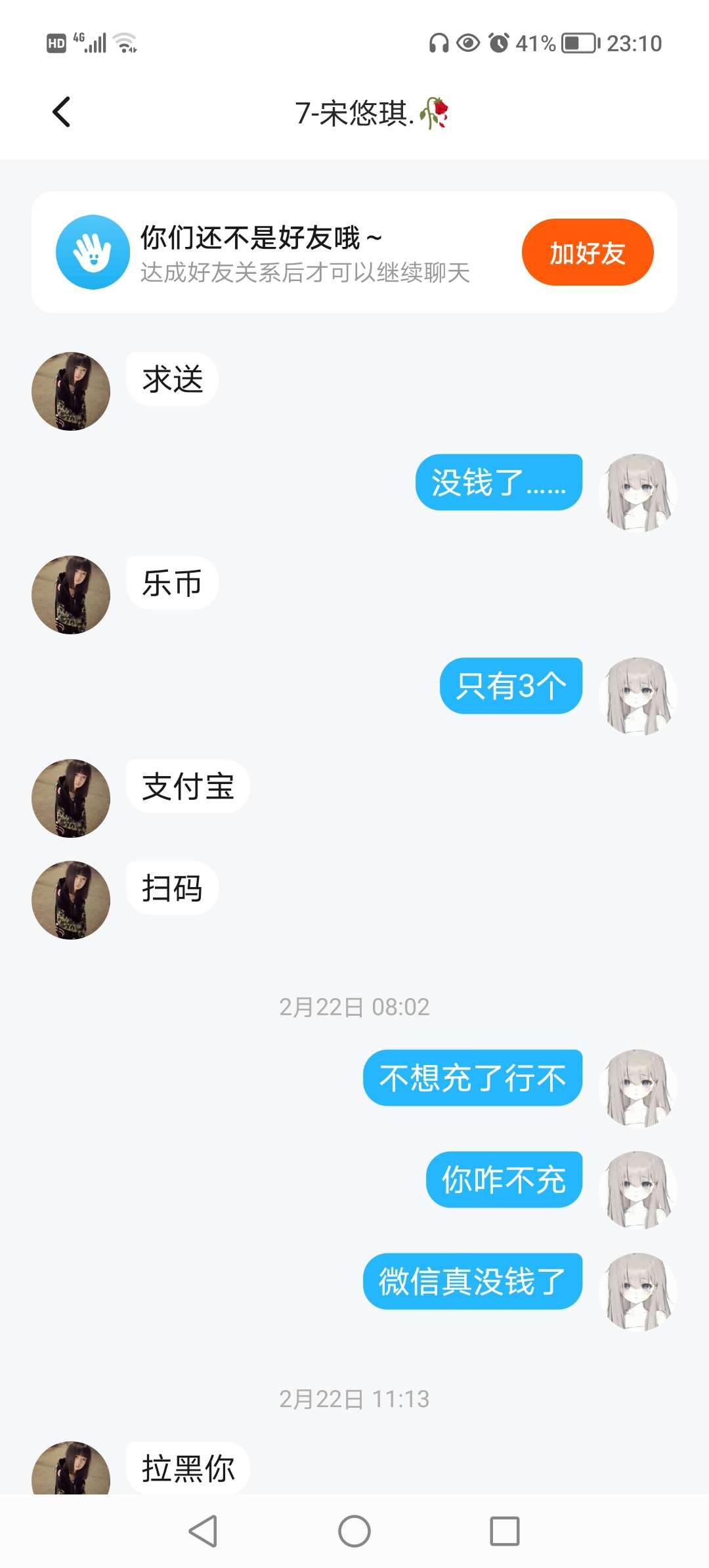 #迷惑行为 天!!!怎么有人这样啊服了……好不要脸……我本来就没钱了 主页说不充了 还有加我好友要礼都不写申请礼由的么 上来就要 一点素质都没有我看消息的温馨提示都提示好几遍了她都不改一下说法的么?