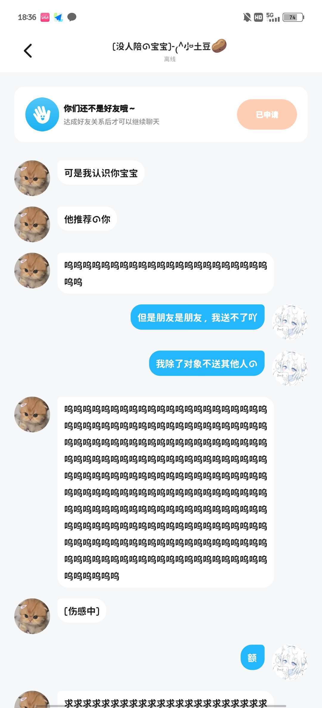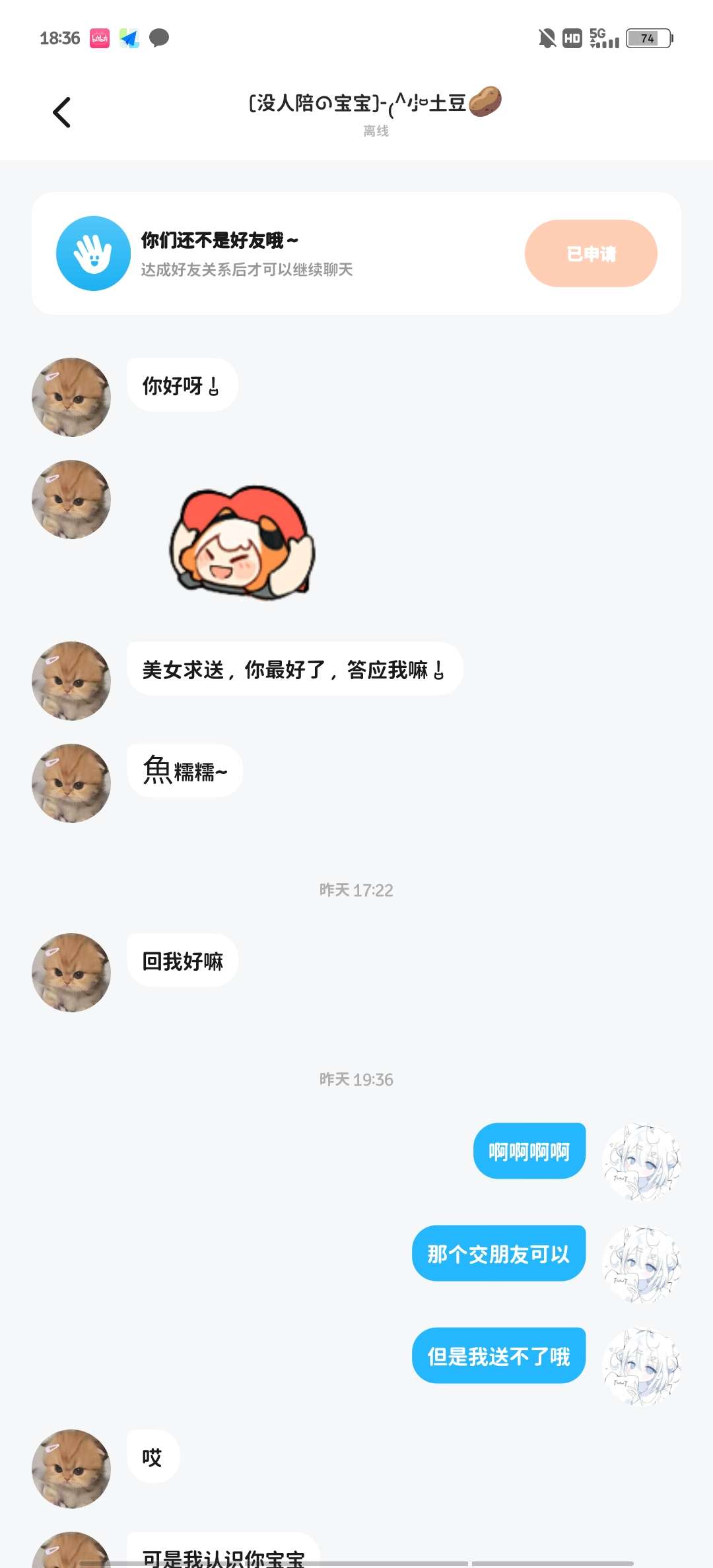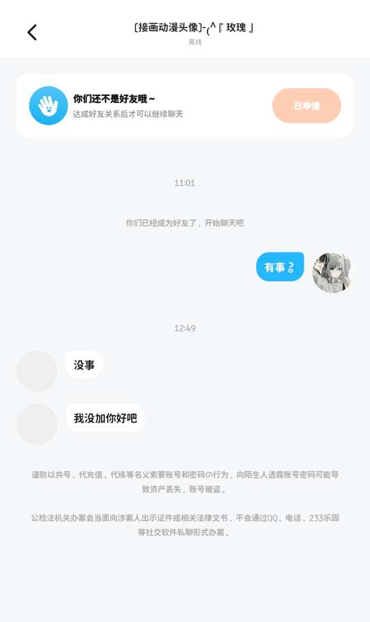 :起因是我对象说她要加我,说她没有朋友,让我们一起玩,结果刚聊天就要皮肤,详情见图片。我多次拒绝她就装可怜,事后骂我删除,一看她帖子的评论也是一堆人控诉 我找我对象了解情况,是她看我对象有特效以为我对象有钱,便要皮肤,得知是我送的便加我,这种人,懒得喷 骂我的话都是百度现搜的,骂的一点没有含量哈,有本事线下对喷👎👎👎