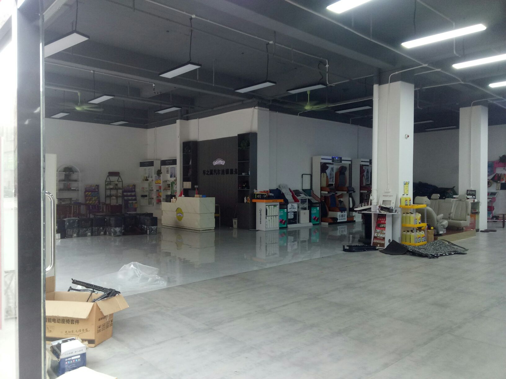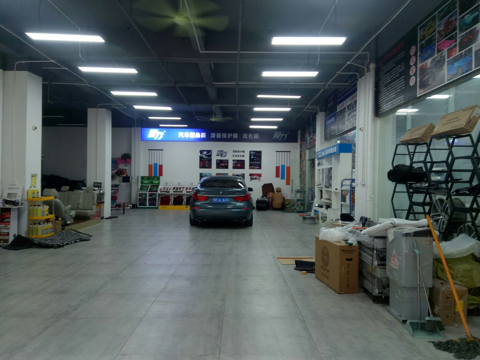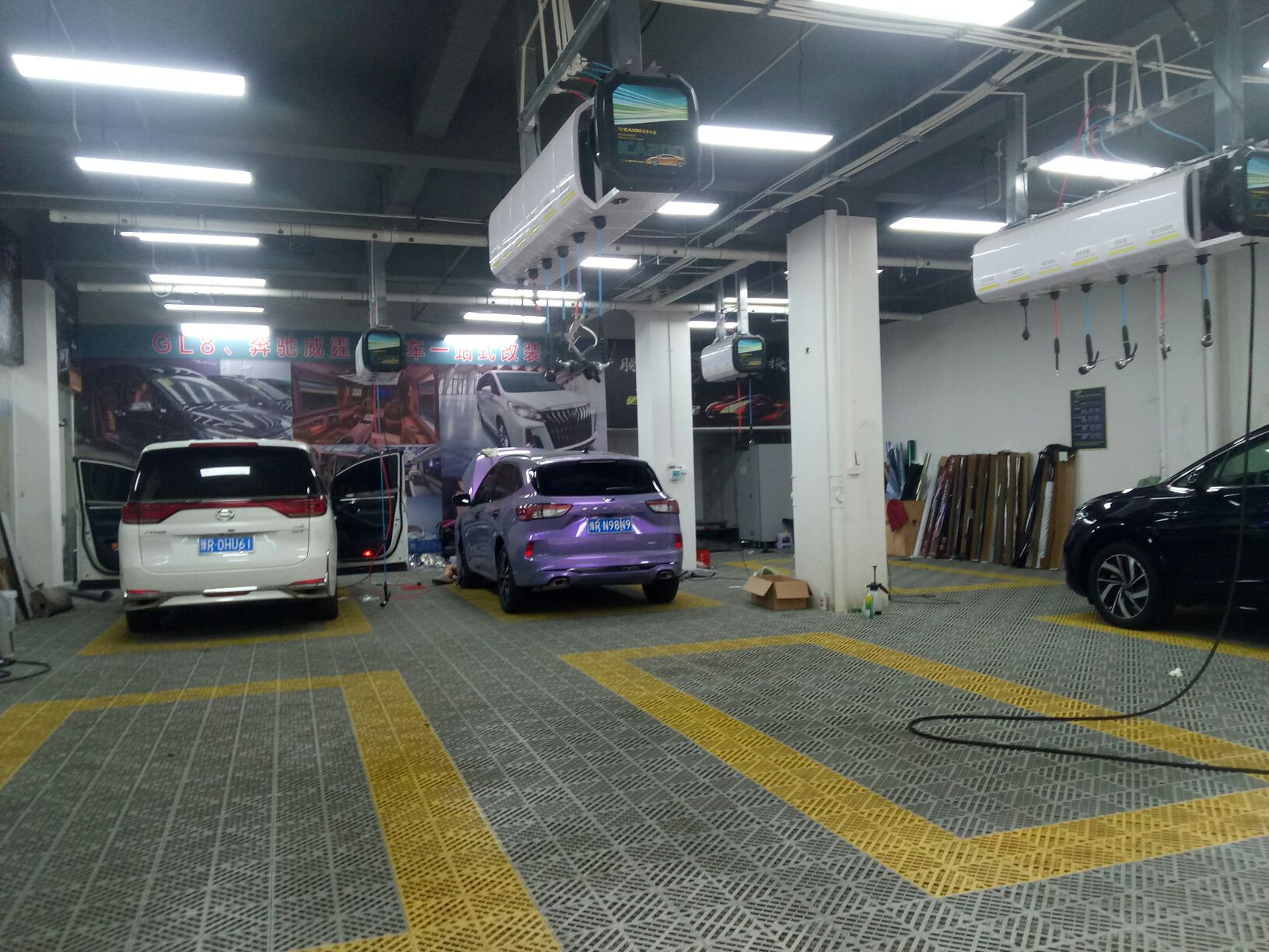 来,让你们看看我上班的地方。紫色的车在贴改色膜,然后那个白色传奇在贴太阳膜。
