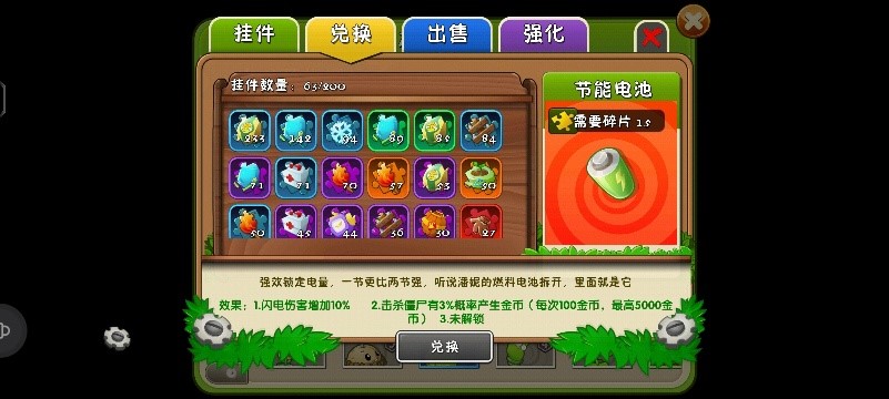 5.在追击竞速方面而言,四大挂件用处排名从高到底依次是:聚能电池、警用电击棍、电击棍、节能电池。因为聚能电池的冷却增幅要大于警用电击棍,而竞速的根本就是争分夺秒,可能一秒之差便是天差地别,且聚能电池自带阳光消耗数量减少,这一加成极大减少了竞速上阳光问题带来的压力,反观警用电击棍虽然警棍伤害增幅要高于聚能电池3%,但是在大部分情况下这3%通常可以忽略不计,因为植物本身速刷类伤害都很高,基本上不需要增加那多余的3%的伤害便可以处理掉僵尸。