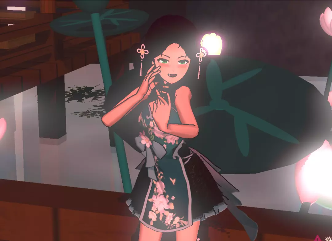 荷风绕廊,灯影映着罗裙上的花影。她执扇而立,似要将这满池月色,都拢入袖中
