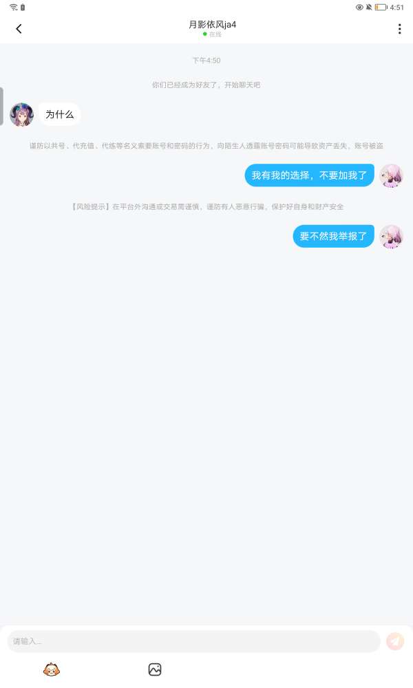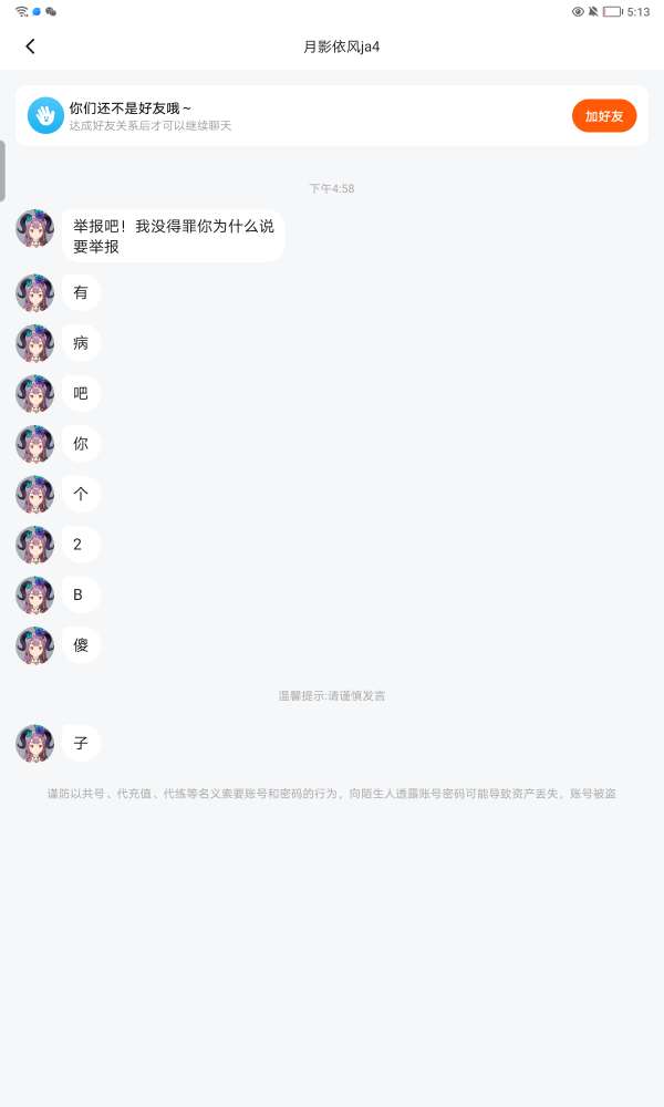 有个叫月影依风ja4的人,首先她先无缘无故骂我闺蜜,然后又不断加我好友,我删一次她加一次,然后呢我说你不要再加我了,她没说话,我把她删了,大概5分钟之后,她又加我,然后我同意了,她就发了个为什么,我跟她说不要在加我了,要不然我就举报了,然后我去刷视频了,回来发现她骂我了,所以家人们可以帮我举报一下吗,举报后把截图发到评论区里,我统一关注