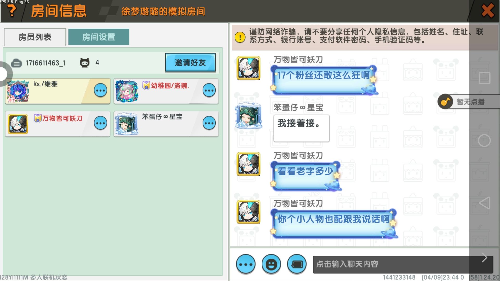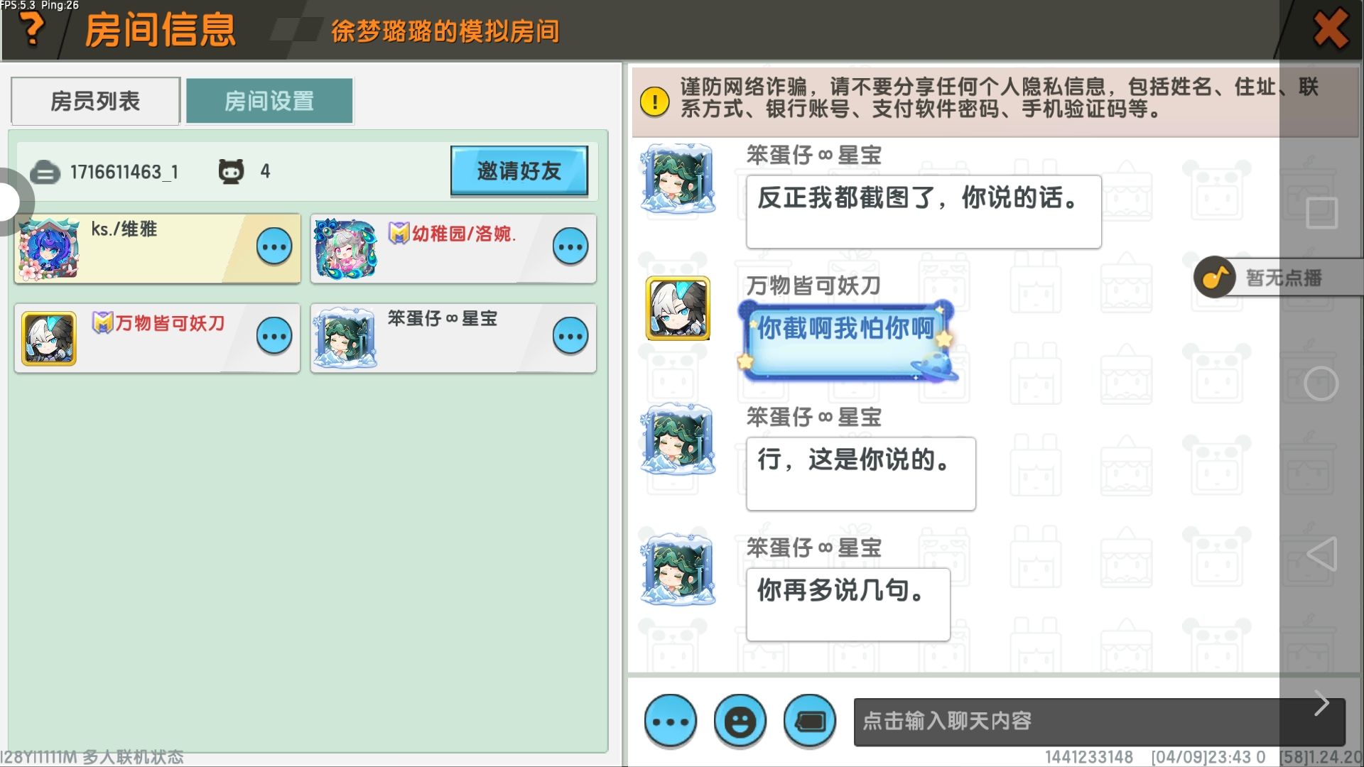 跟好友进了一个房间,房主就一直打我们,关了我们所有权限,将房间禁了言,可能怕我们骂他,下面是证据