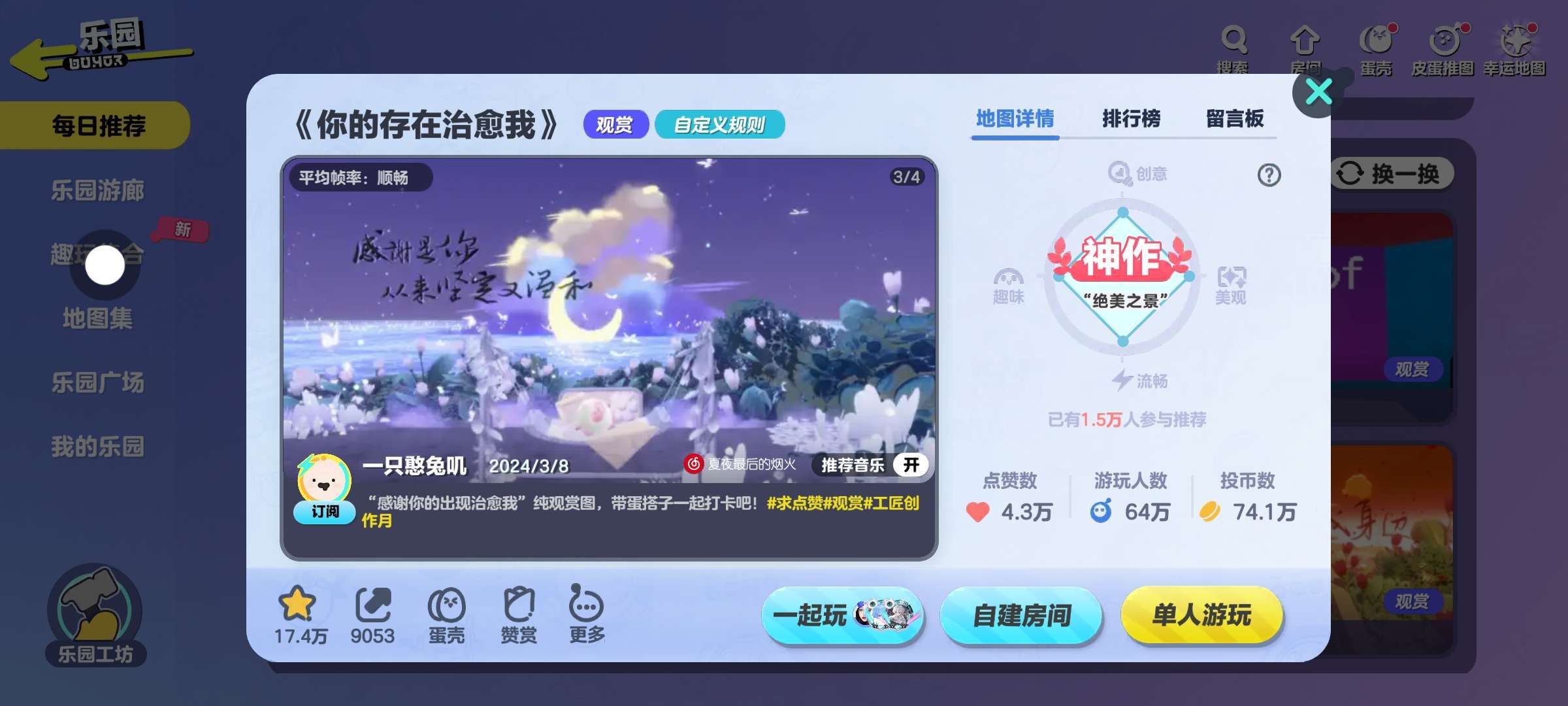 整体来说这个地图也是非常好看的,比较推荐新手来玩,全程无销毁的,特别适合表白,这么好看的地图,你们确定不来玩一下吗?马上就要结束了,如果有好看的地图跟我说,下一期说不定会抽到你的,我们下一期见吧,拜拜~