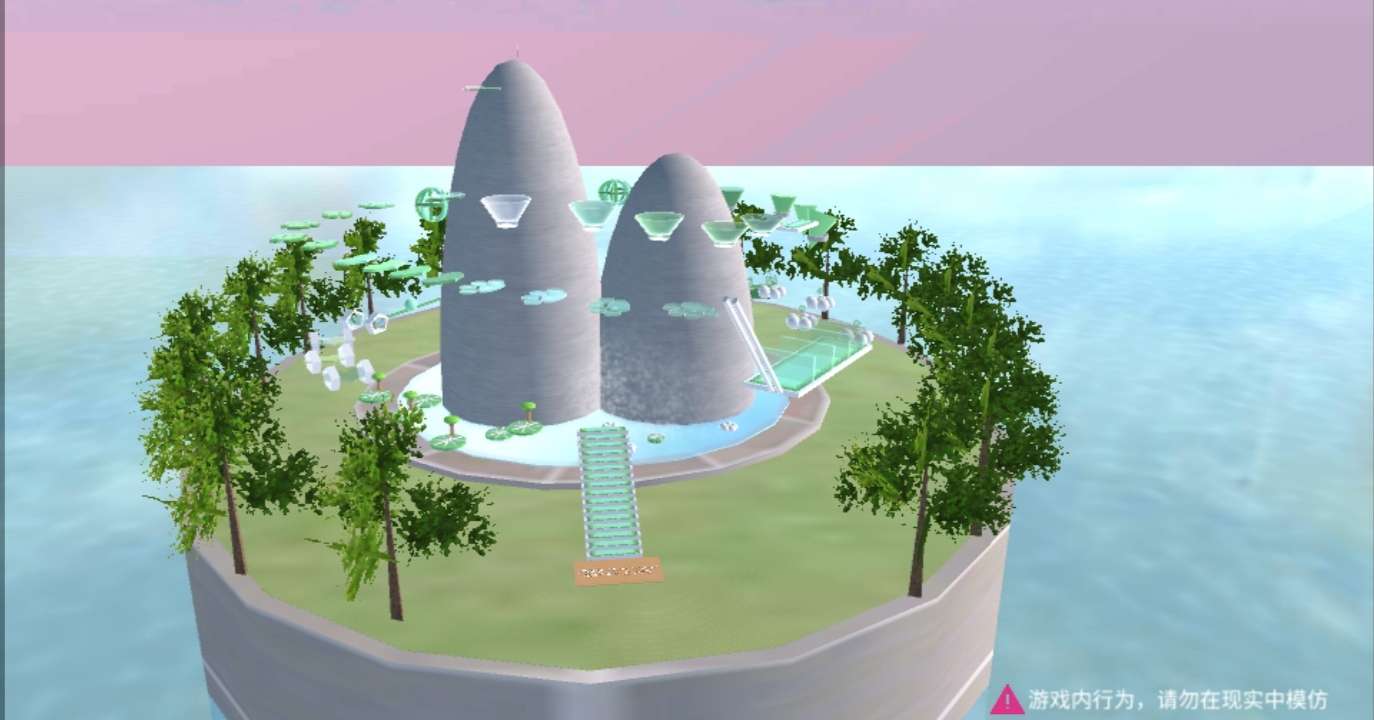 这个外观还是花了我一些时间的🕰️ 外面由好几棵大树🌲围绕着 呈圆形○ 中间有一个小池塘 里面有两座假山⛰️ 池塘里有一些荷叶与花朵🌸 细节还是有的💗