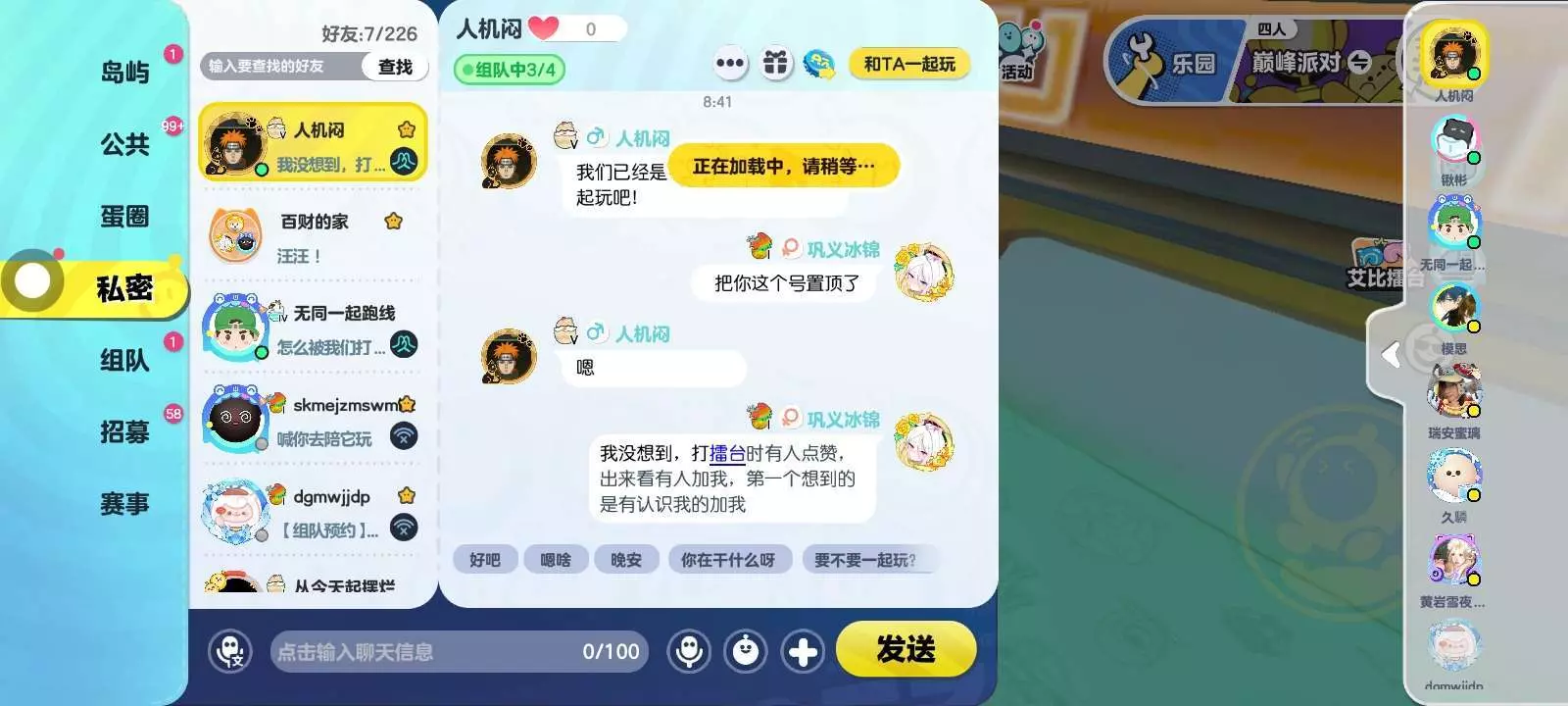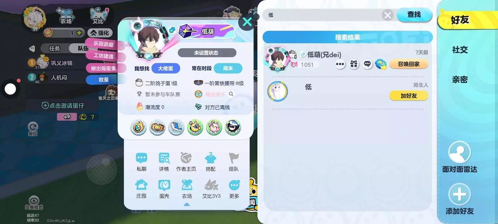 和朋友打擂台时发现有人给我点赞,出来后有个人加我,然后他在岛屿上说:猜猜我是谁,我好友以为他是煎蛋,要保护我,结果我意识到了什么,他说:我是低葫啊……