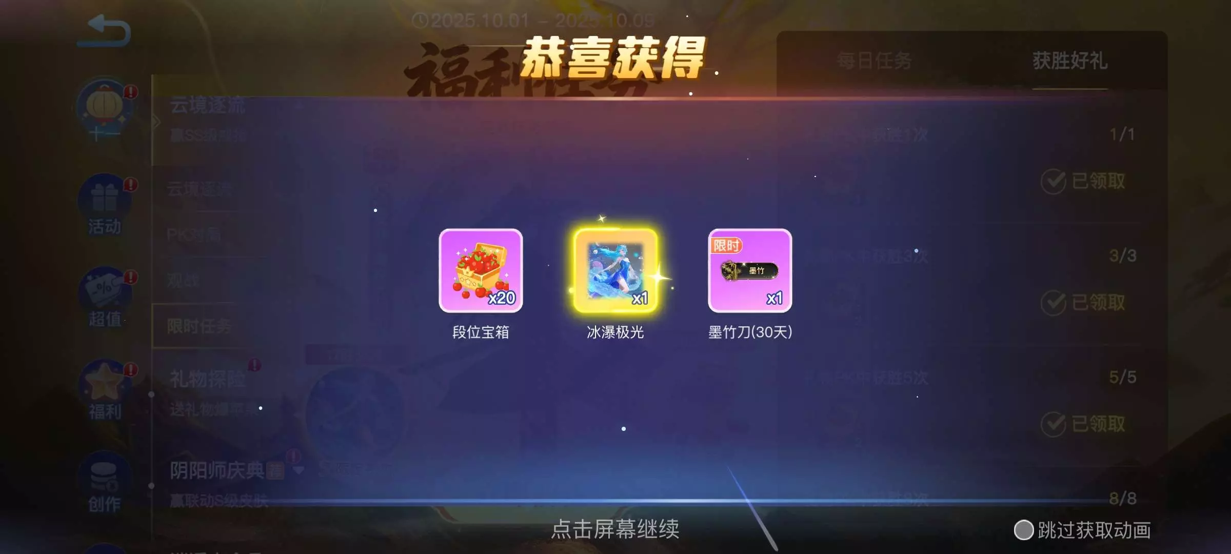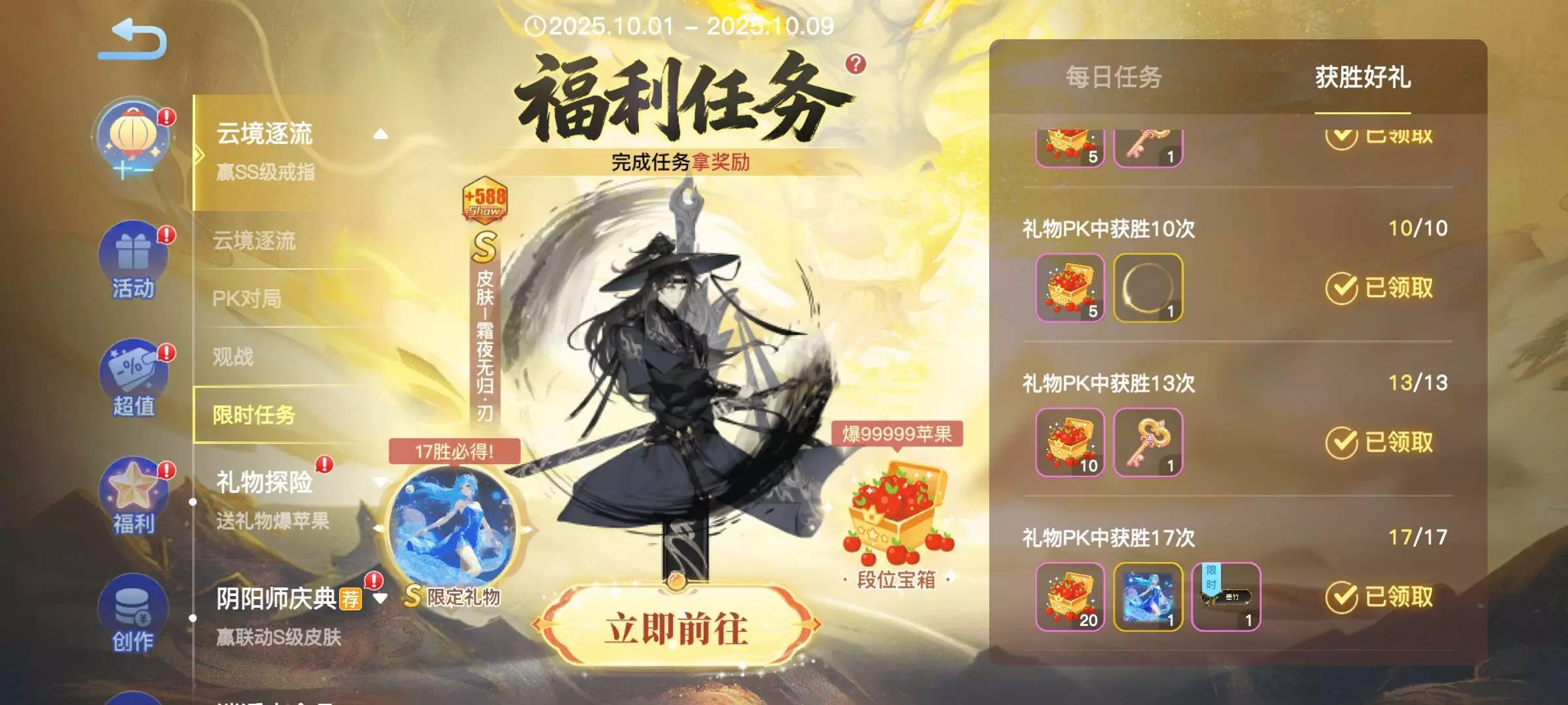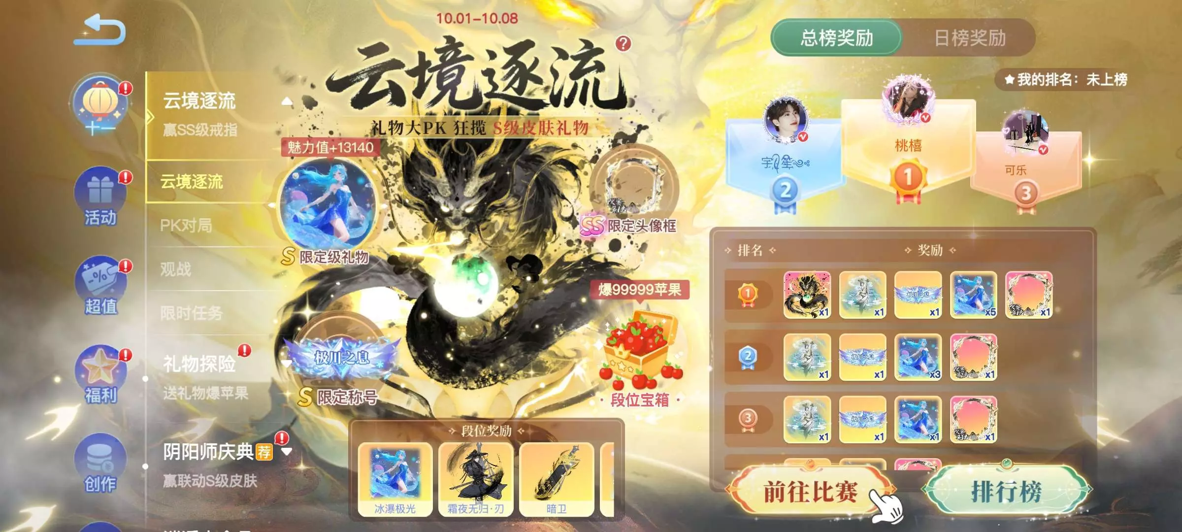 贪吃蛇大作战页面中心右上角云境逐流活动靠送飞鹤礼pK敌对玩家,一个飞鹤送自己pK局就是8积分,PK中要超越敌对玩家方可取胜,总共要获胜17局才可以拿到限定,每一局获胜还可以拿相应的限时奖励,每一局PK时间结束为一个小时。大部分人很少去管理PK所以获胜机率高主要匹配全是靠系统推荐,哪怕对方0积分你8积分一个飞鹤一局PK结束也能获胜,没有飞鹤可以在蛇界蹲飞鹤礼或者也可以问朋友要,让朋友助你积分