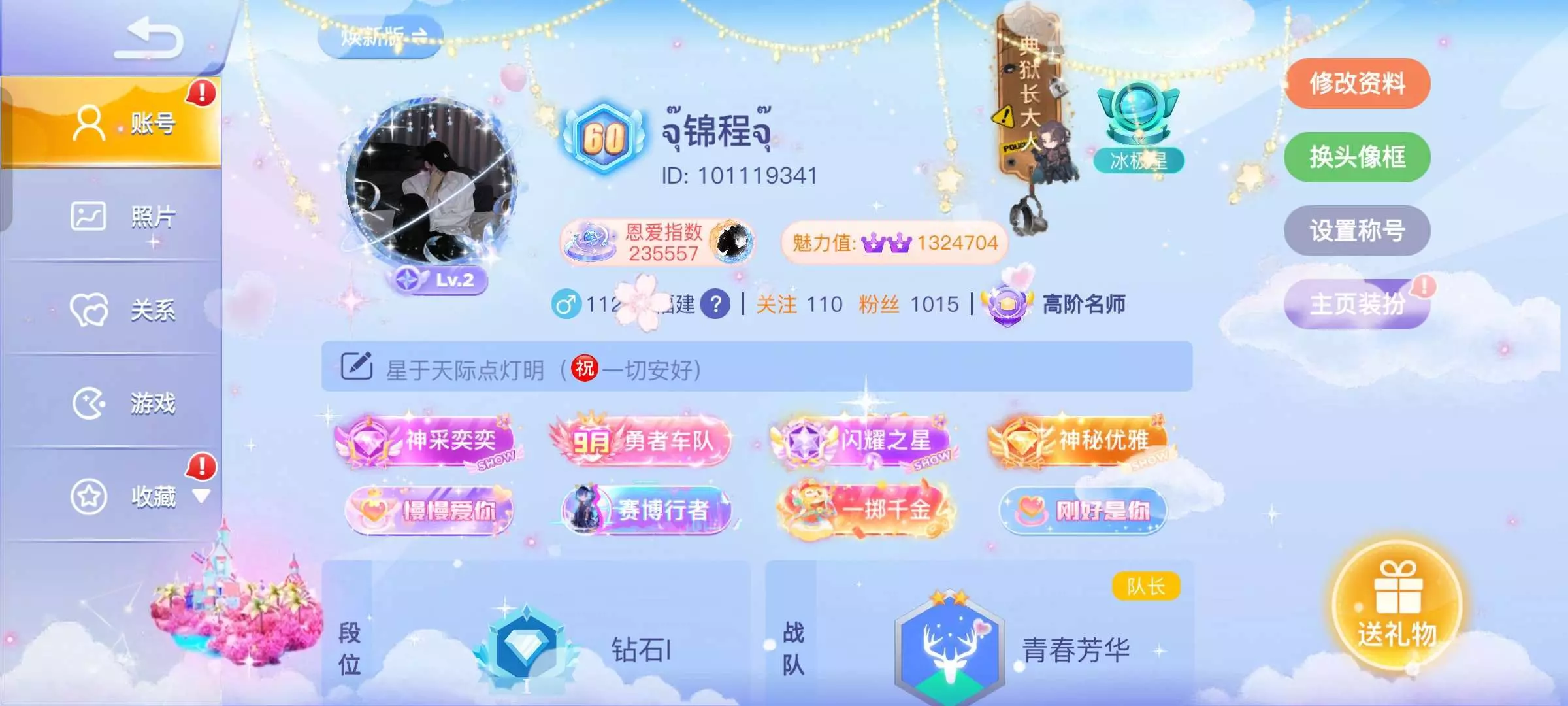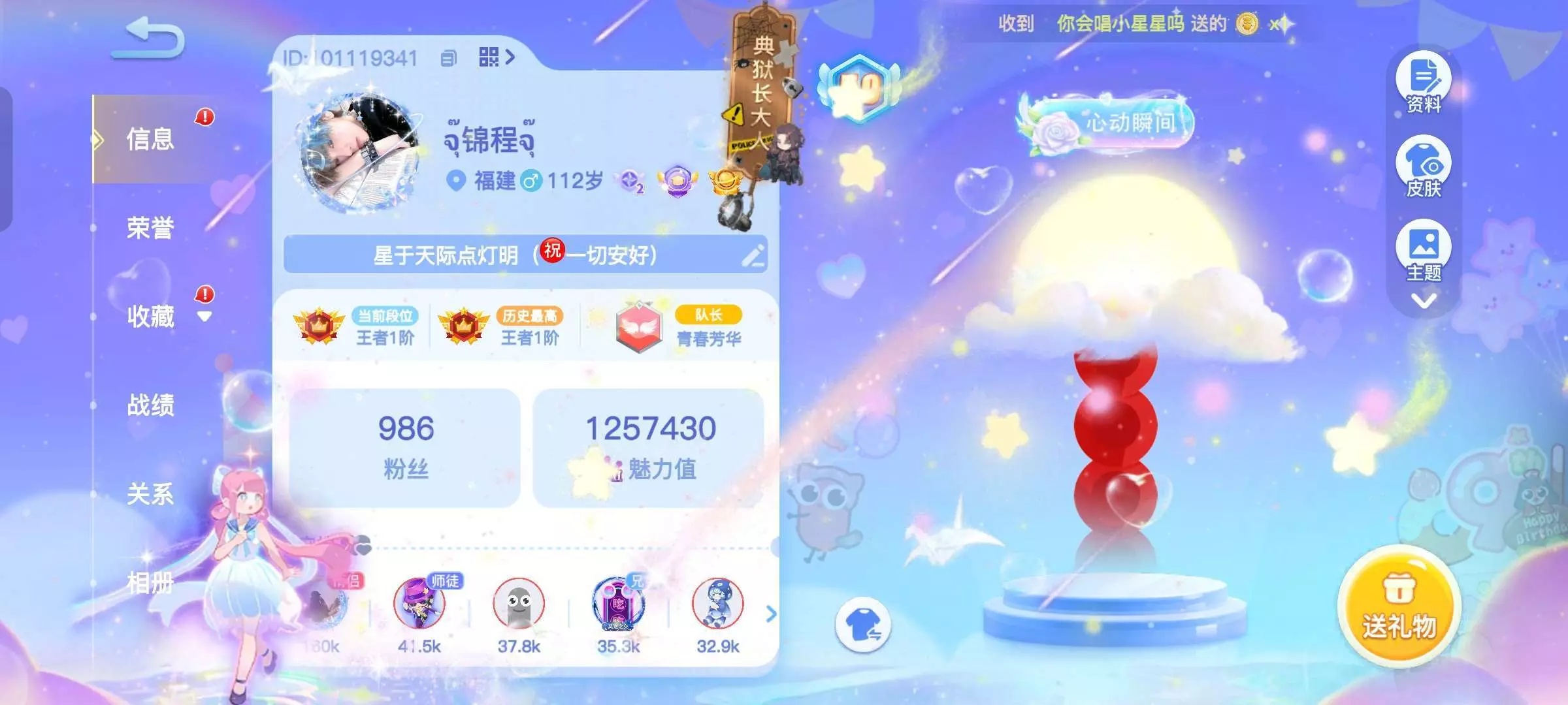 ③在游戏页面头像边上有个show级图标,点图标可以看到自己Show级数值会显示还差多少升下一级show当达到相应的Show级它会显示拿奖励比如卷和礼物,达到级别后点自己头像就回到个人主页中心页面左边框栏找到收藏点进去,再开启show之旅领取高级宝箱和礼物皮肤,获得高级宝箱,建议在宝箱里如果有苹果和皮肤卷这三样只能选一个就选苹果🍎,🍎先别花留着再回到Show之旅右上角有个限时点进去把刚得來的苹果出了可以获得好几个高级宝箱接着开宝箱,星座皮肤宝箱随便选一个自己喜欢的皮肤,星座头像框宝箱里面有星座头像框还有AB级礼物,只能选一个东西,头像框和礼物自己选一个,另外一个S宝箱有A/B/S礼物只能随机都是跑车限定之类的看自己运气