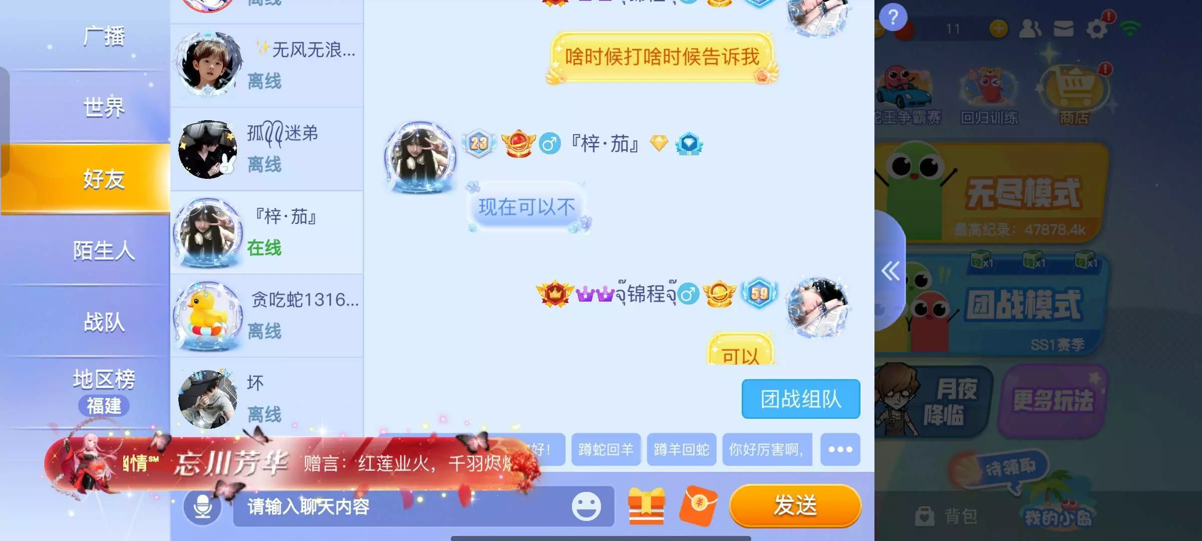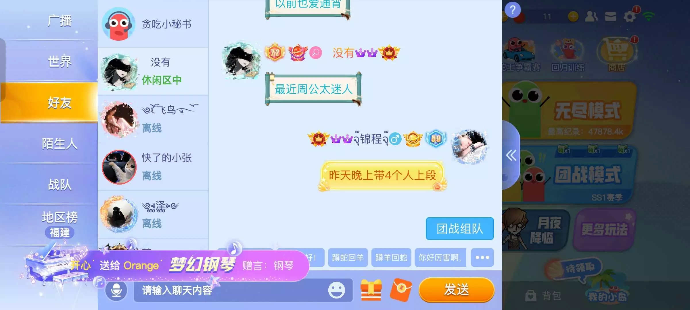 天天带段人很多人来一波接一波有时候打的也很累,没有朋友之前一个人孤零零的又无聊(=_=)想找个人说话都没有后来认识好多人也成为了好友可没有玩多久都退游了,例表里好友再多也比不过相处几年的朋友,例表新好友再多也会成为过客彼此之间再无语言就好像成未来过