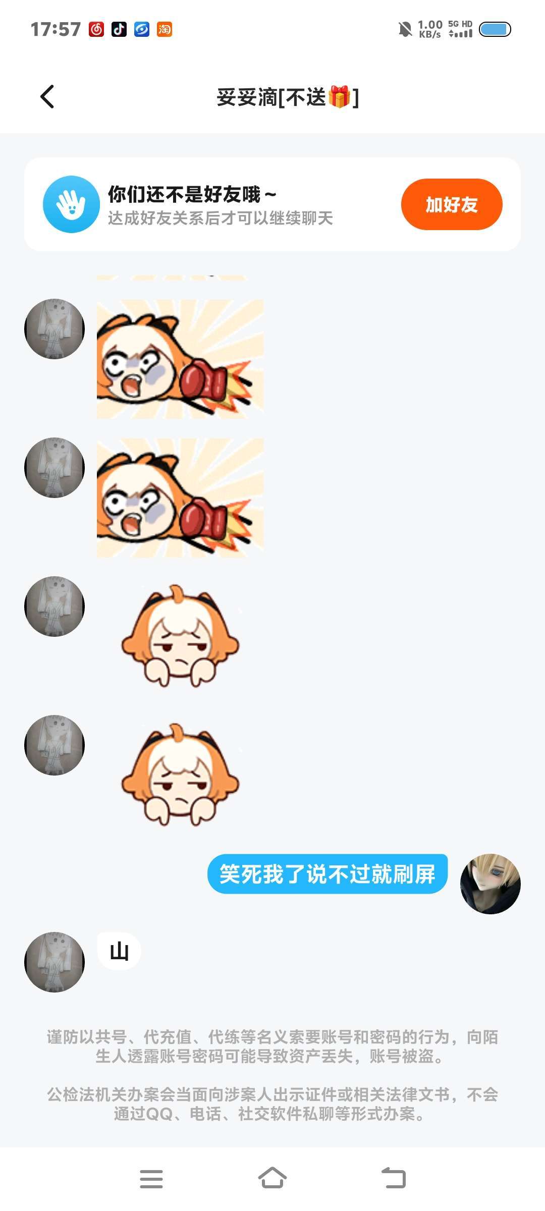 真是够神经的哈什么叫做不是说了吗我爱送什么送什么你是我谁吗送啥你管得着吗还催我一般人看到不回就当是不想送了哈你那个脸皮如城墙哈逆如天我造密码真是没有公主的命得了公主的病哈避雷这个人哈我送了也是送了不是你想要的就不算送吗还牛魔把我删了要删也是我先删你好吧我送你东西你有什么发言权要不要这么搞笑😂😂😂