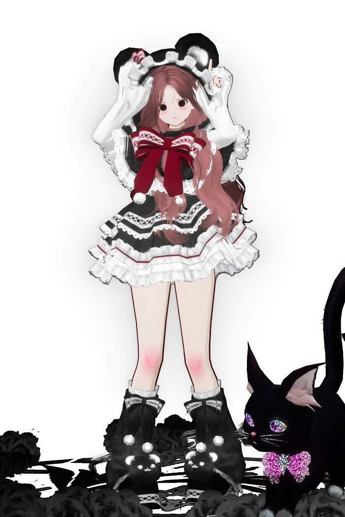一头喑绯赤色的头透露一丝神秘气息,一件带黑色的裙子,腰边系着鲜艳的蝴蝶结,裙边带有蕾丝。再搭配一双毛茸茸的黑色鞋子,像是一位从圣诞老人送的礼物盒中逃出的公主