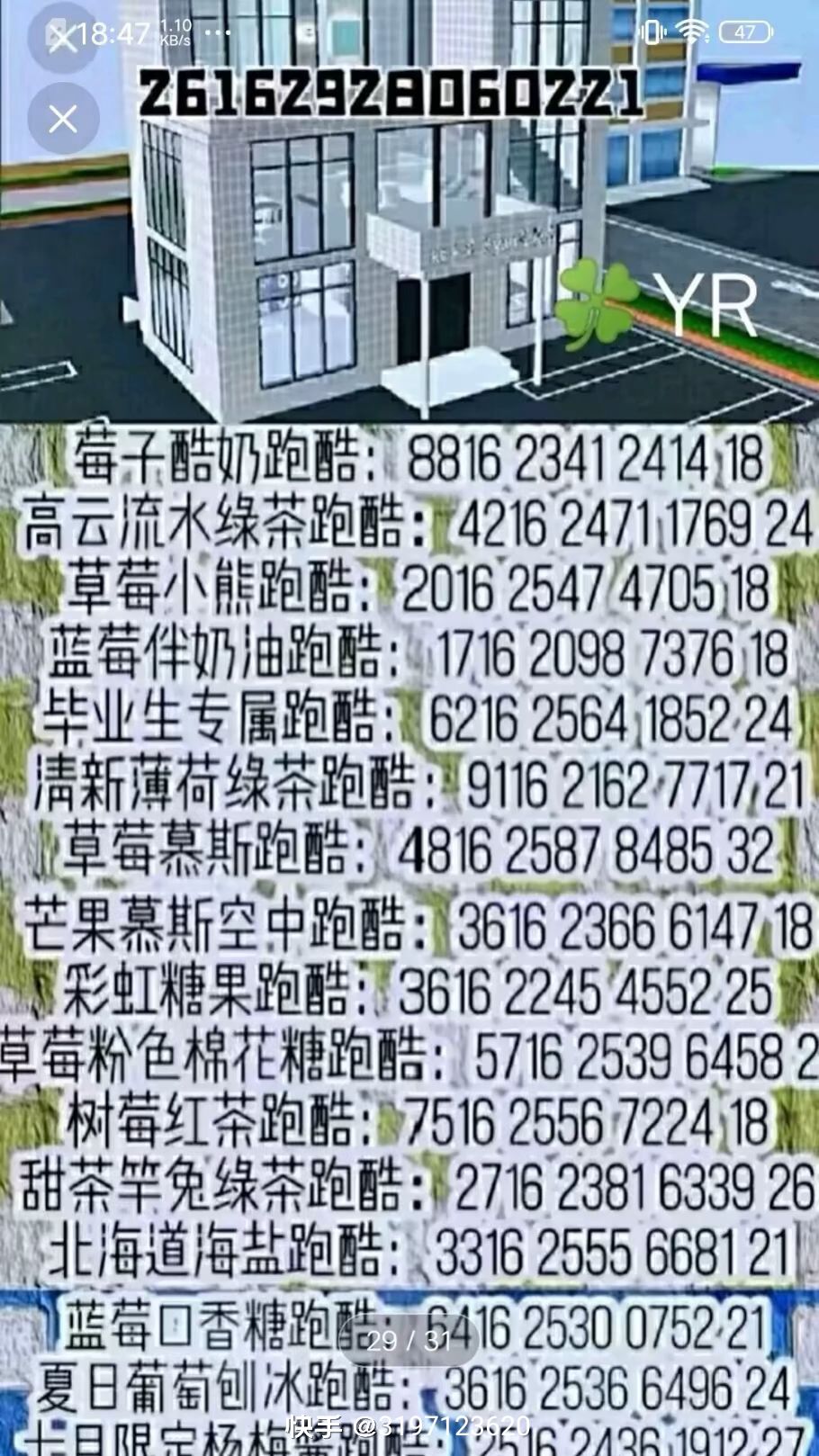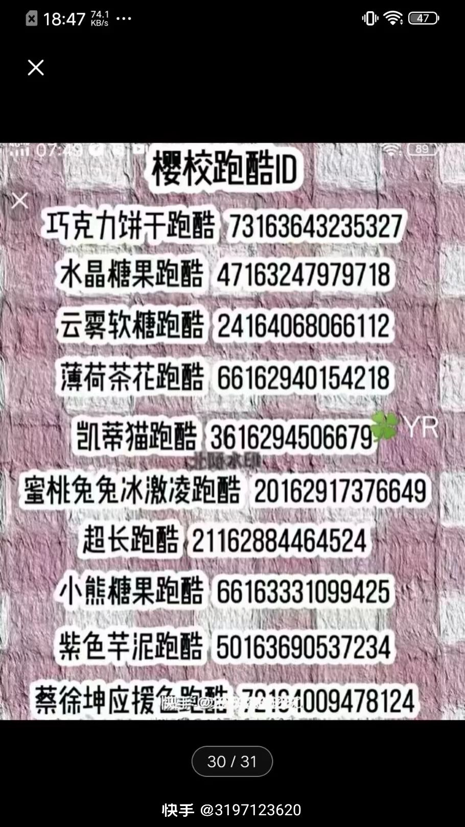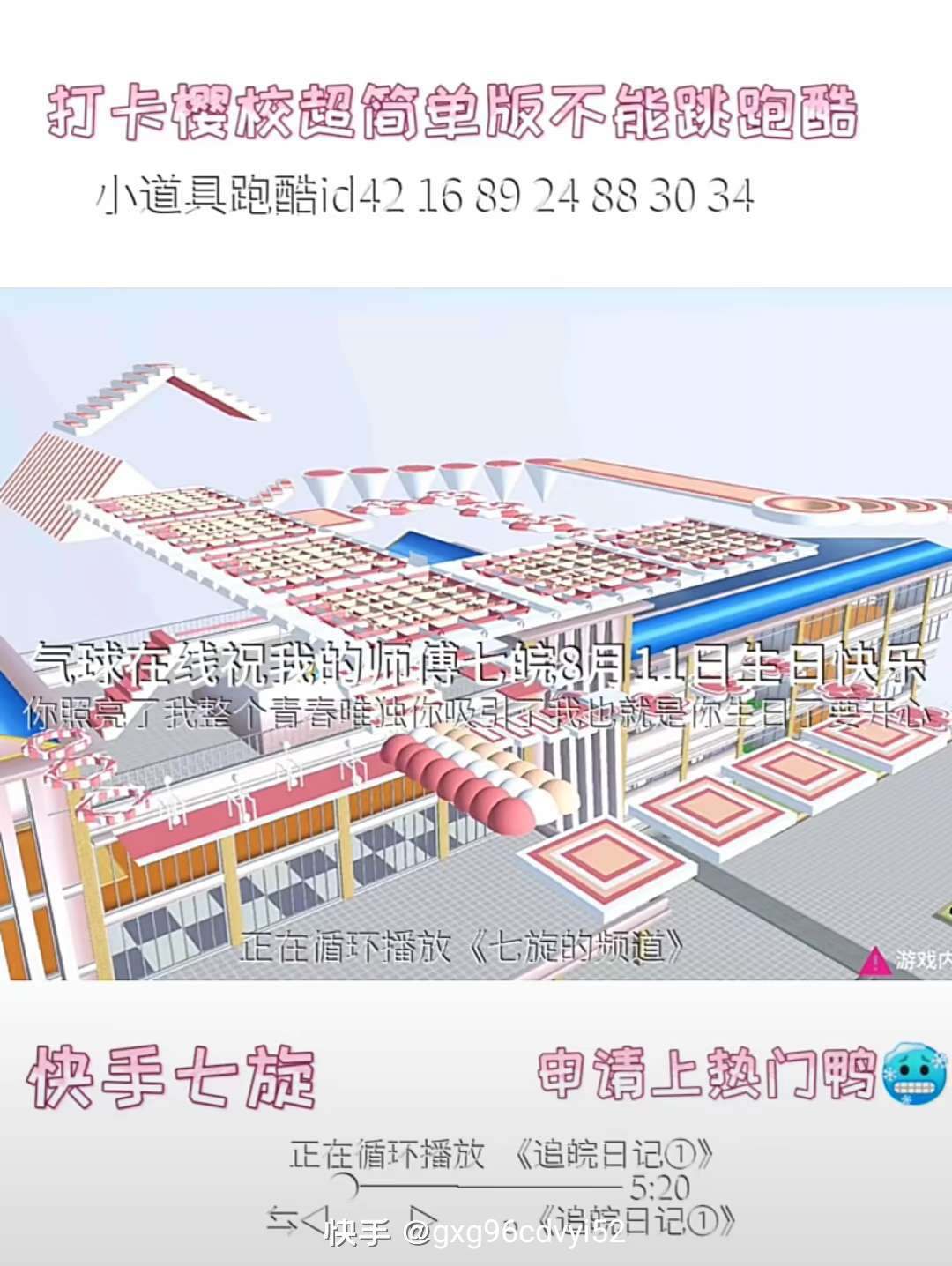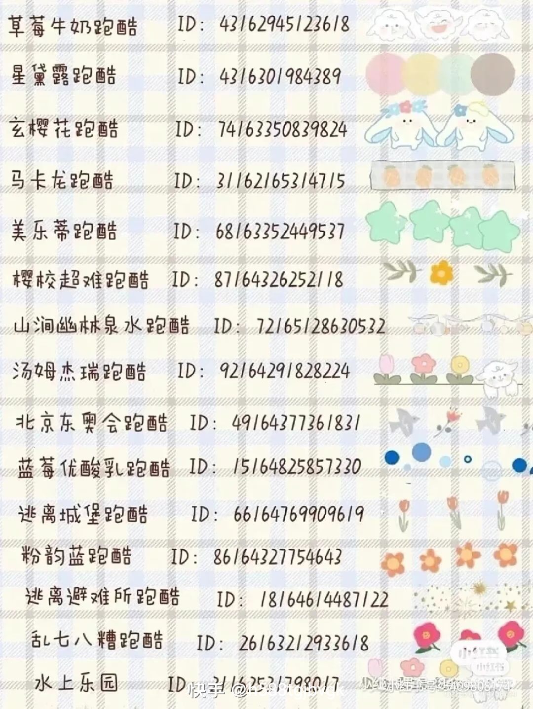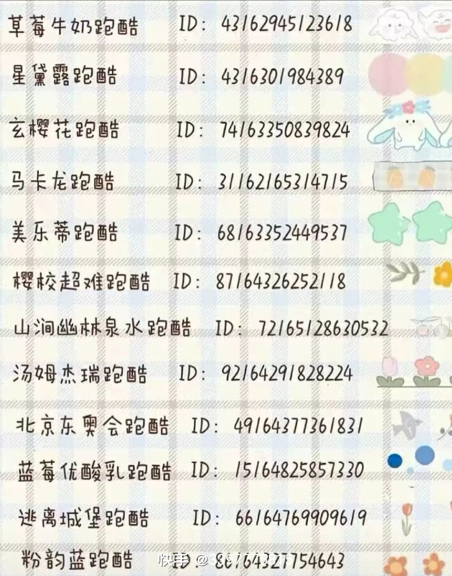 跑酷ID和建筑ID都有可以在快手上搜有很多建筑跑酷ID也有卡点可以自己搜索还有卡点和樱校新手小技巧新手有不会的可以去搜索自己想要的素材