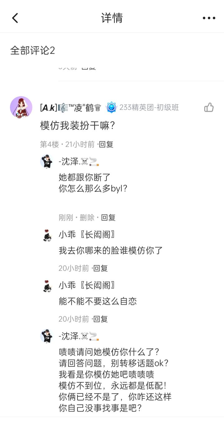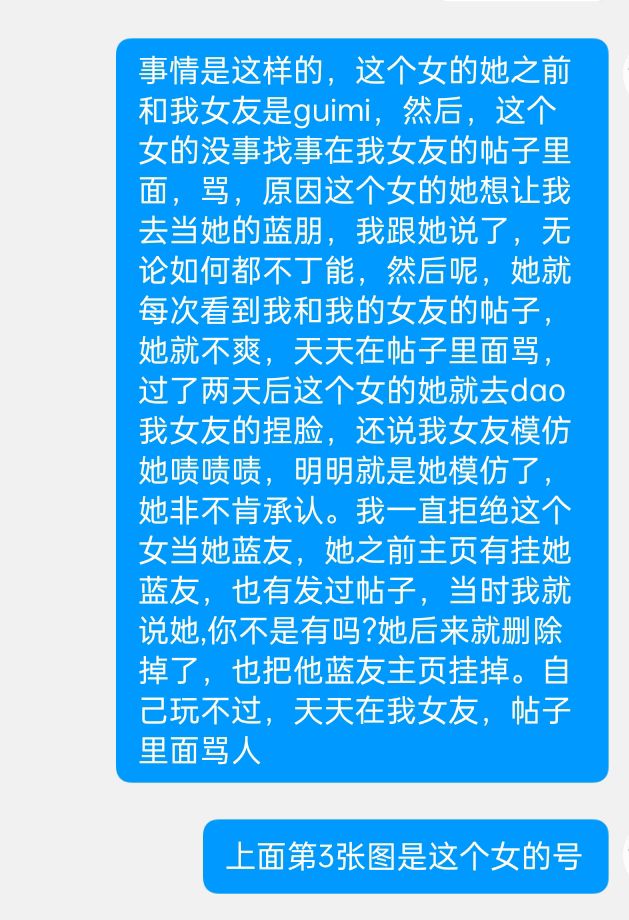mi,然后,这个女的没事找事在我女友的帖子里面,骂,原因这个女的她想让我去当她的蓝朋,我跟她说了,无论如何都不可能,然后呢,她就每次看到我和我的女友的帖子,她就不爽,天天在帖子里面骂,过了两天后这个女的她就去dao我女友的捏脸,还说我女友模仿她啧啧啧,明明就是她模仿了,她非不肯承认。我一直拒绝这个女当她蓝友,她之前主页有挂她蓝友,也有发过帖子,当时我就说她,你不是有吗?她后来就删除掉了,也把他蓝友主页挂掉。自己玩不过,天天在我女友,帖子里面骂人。上面第三张图就是这个女,一直模仿别人。