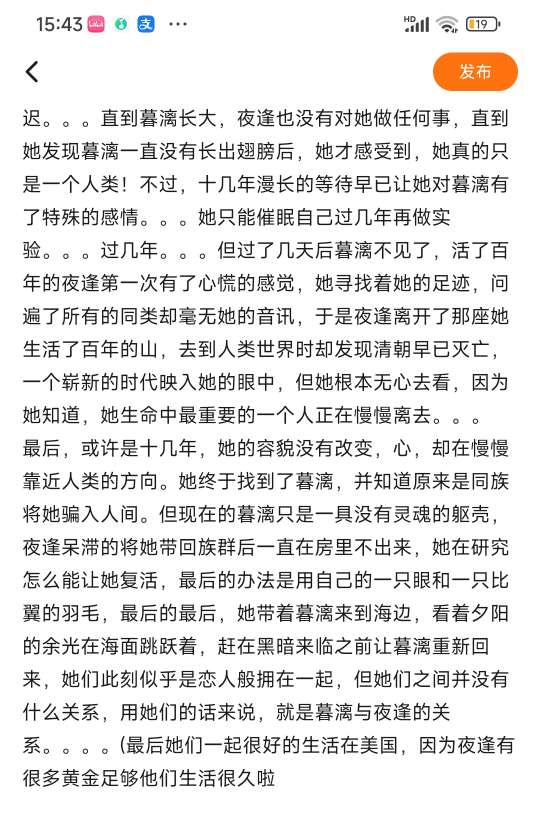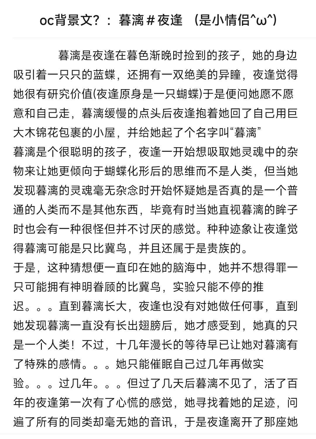 暮漓是夜逢在暮色渐晚时捡到的孩子,她的身边吸引着一只只的蓝蝶,还拥有一双绝美的异瞳,夜逢觉得她很有研究价值(夜逢原身是一只蝴蝶)于是便问她愿不愿意和自己走,暮漓缓慢的点头后夜逢抱着她回了自己用巨大木锦花包裹的小屋,并给她起了个名字叫“暮漓” 暮漓是个很聪明的孩子,夜逢一开始想吸取她灵魂中的杂物来让她更倾向于蝴蝶化形后的思维而不是人类,但当她发现暮漓的灵魂毫无杂念时开始怀疑她是否真的是一个普通的人类而不是其他东西,毕竟有时当她直视暮漓的眸子时也会有一种很怪但并不讨厌的感觉。种种迹象让夜逢觉得暮漓可能是只比冀鸟,并且还属于是贵族的。 于是,这种猜想便一直印在她的脑海中,她并不想得罪一只可能拥有神明眷顾的比冀鸟,实验只能不停的推迟。。。直到暮漓长大,夜逢也没有对她做任何事,直到她发现暮漓一直没有长出翅膀后,她才感受到,她真的只是一个人类!不过,十几年漫长的等待早已让她对暮漓有了特殊的感情。。。她只能催眠自己过几年再做实验。。。过几年。。。但过了几天后暮漓不见了,活了百年的夜逢第一次有了心慌的感觉,她寻找着她的足迹,问遍了所有的同类却毫无她的音讯,于是夜逢离开了那座她生活了百年的山,去到人类世界时却发现清朝早已灭亡,一个崭新的时代映入她的眼中,但她根本无心去看,因为她知道,她生命中最重要的一个人正在慢慢离去。。。 最后,或许是十几年,她的容貌没有改变,心,却在慢慢靠近人类的方向。她终于找到了暮漓,并知道原来是同族将她骗入人间。但现在的暮漓只是一具没有灵魂的躯壳,夜逢呆滞的将她带回族群后一直在房里不出来,她在研究怎么能让她复活,最后的办法是用自己的一只眼和一只比翼的羽毛,最后的最后,她带着暮漓来到海边,看着夕阳的余光在海面跳跃着,赶在黑暗来临之前让暮漓重新回来,她们此刻似乎是恋人般拥在一起,但她们之间并没有什么关系,用她们的话来说,就是暮漓与夜逢的关系。。。。(最后她们一起很好的生活在美国,因为夜逢有很多黄金足够他们生活很久啦