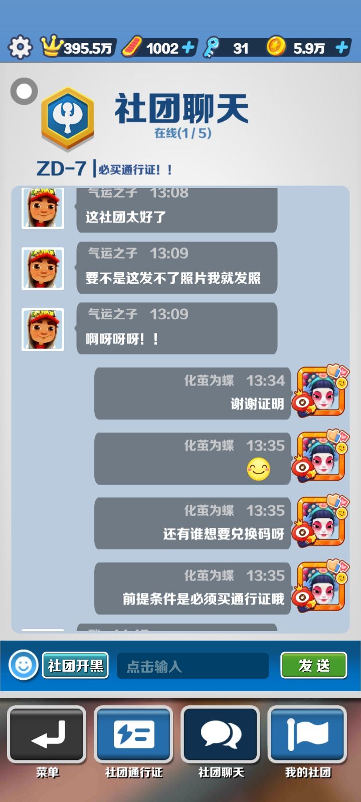 ZD社团招人啦!(7团)在FANBOOK社区要求是很高的,但毕竟这里是渠道服,所以要求也就大大降低了:1.无尽模式350万以上2.道具赛黄金以上3.分数赛大师以上4.荣誉榜达到钻石5.必买通行证6.人物滑板共30+7.活跃,每天个每周的人物是必做的8.有素质,不然t9.不要刷子,科技,破解,乞讨,卡...10.滑板秋凉500+要求就这么多了,接下来就是福利了:1.没有FANBOOK社区的也不用担心了,社团会及时发送官方兑换码(像昨天就是一天三个兑换码,最久2-3天一个,过节或活动时一天能有4-6个)哦!2.即使没有官方兑换码社团也会发送个人兑换码的,包括但不限于影子,王子,炫跑卡,金币,蓝钥匙,宝物钥匙,超级起跑,得分增倍,各种人物和皮肤的兑换码等等等等。3.活跃度高的或者贡献值高的还会私下发个人兑换码,是100%能领到的哦!不用再拼手速和网速了哦⊙∀⊙!4.实力强和贡献值高的还能升团哦(如七团升六团,七团升四团等)甚至直接升大团也不是没有可能的哦⊙∀⊙!社团ID:2561084