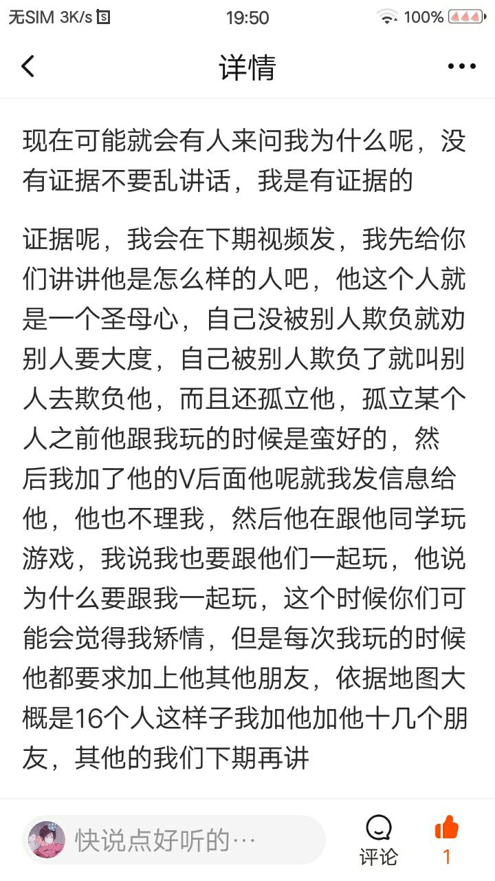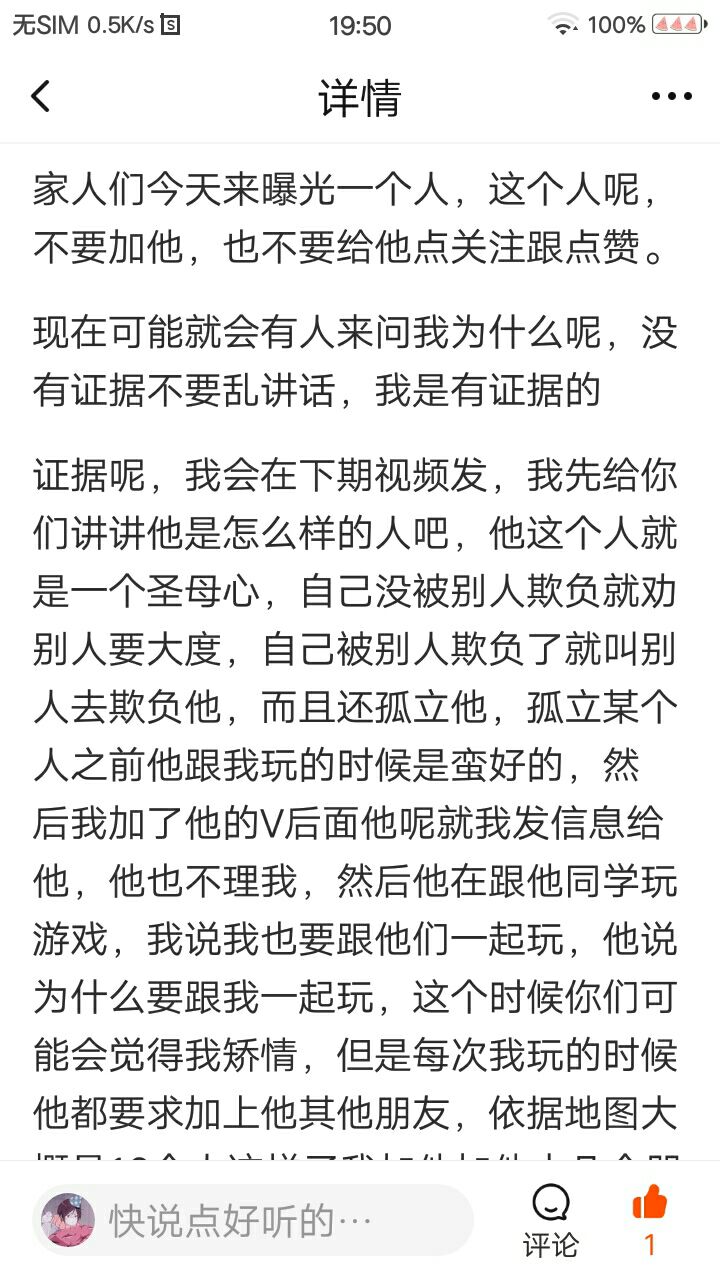 证据呢,我会在下期视频发,我先给你们讲讲他是怎么样的人吧,他这个人就是一个圣母心,自己没被别人欺负就劝别人要大度,自己被别人欺负了就叫别人去欺负他,而且还孤立他,孤立某个人之前他跟我玩的时候是蛮好的,然后我加了他的V后面他呢就我发信息给他,他也不理我,然后他在跟他同学玩游戏,我说我也要跟他们一起玩,他说为什么要跟我一起玩,这个时候你们可能会觉得我矫情,但是每次我玩的时候他都要求加上他其他朋友,依据地图大概是16个人这样子我加他加他十几个朋友,其他的我们下期再讲
