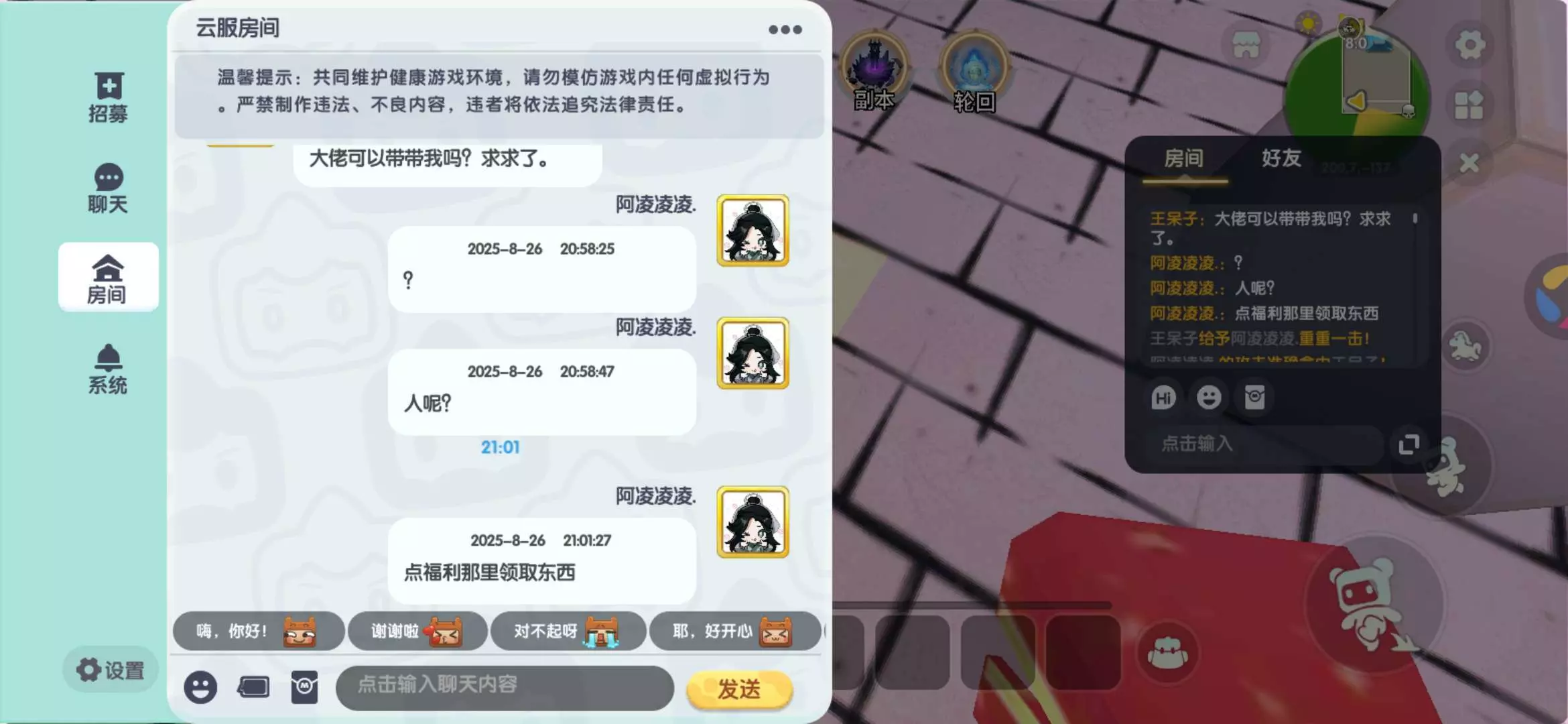 进来就问我可不可以带它(修仙地图),打了怪给他(地图目前最高级的涨修为的),然后它走了(不是退出了)我就去打爆率怪了,它回来之后就吃上自助餐了꒦ິ^꒦ິ我刚点好它就杀了,我以为它想在那里就让来位置,但它还是跟着我,我也没说什么。本来想打字说“你自己打吧,这个我也需要的” 他的伤害不低的,打那个怪一下就可以,但是字还没打完就被它杀了,本来以为它不是故意的,但是等了一会也没有给我道歉,见到我还跑(。í _ ì。)#j
